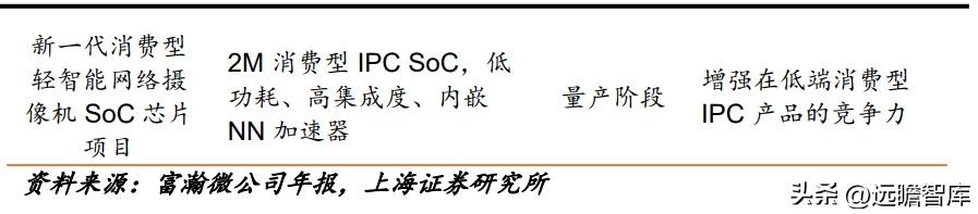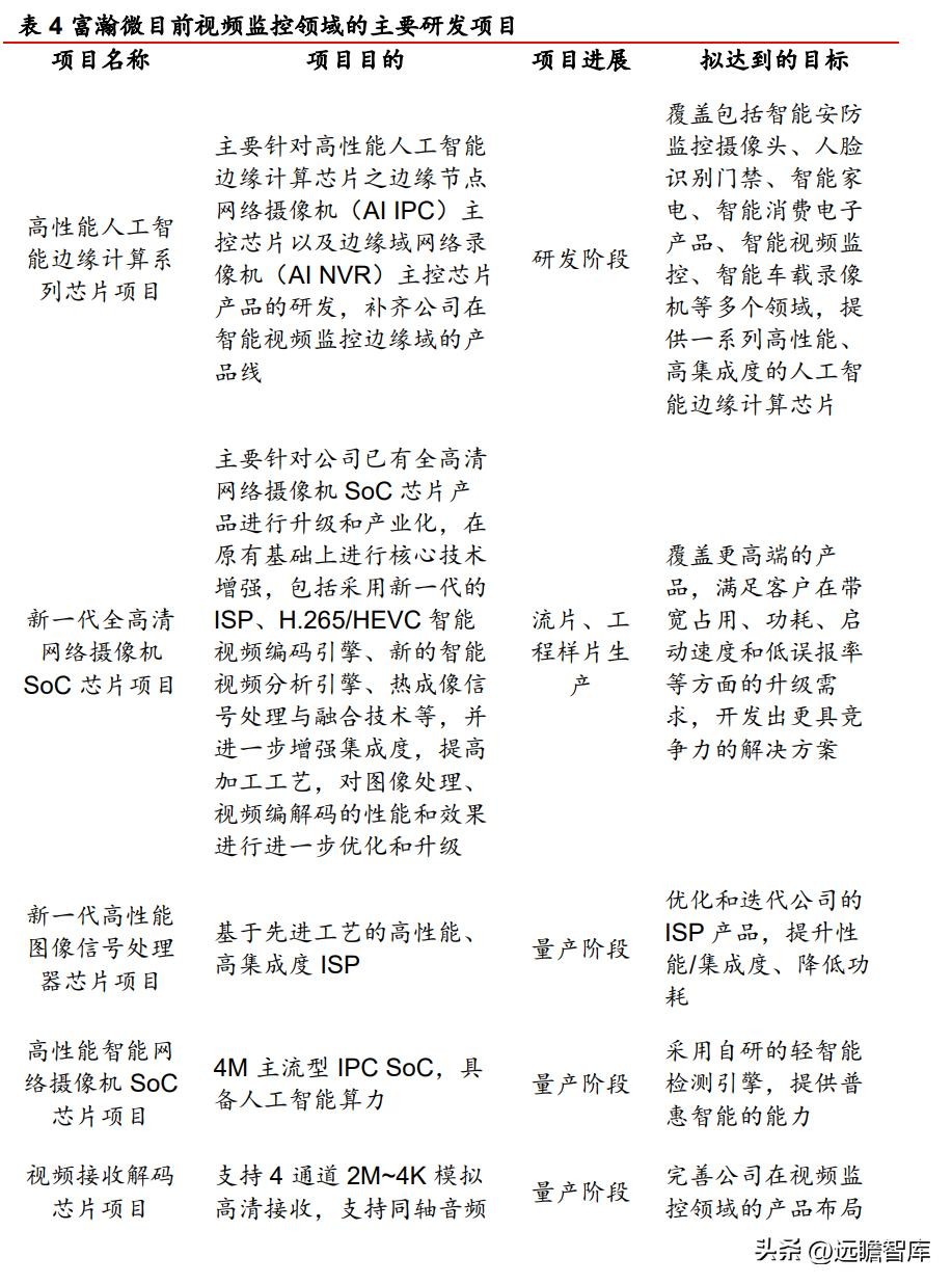 目前,富瀚微针对视频监控行业高清化、智能化的发展趋势,开展多个研发项目(部分项目以至量产阶段),以期完善公司现有的产品布局,提高竞争力。