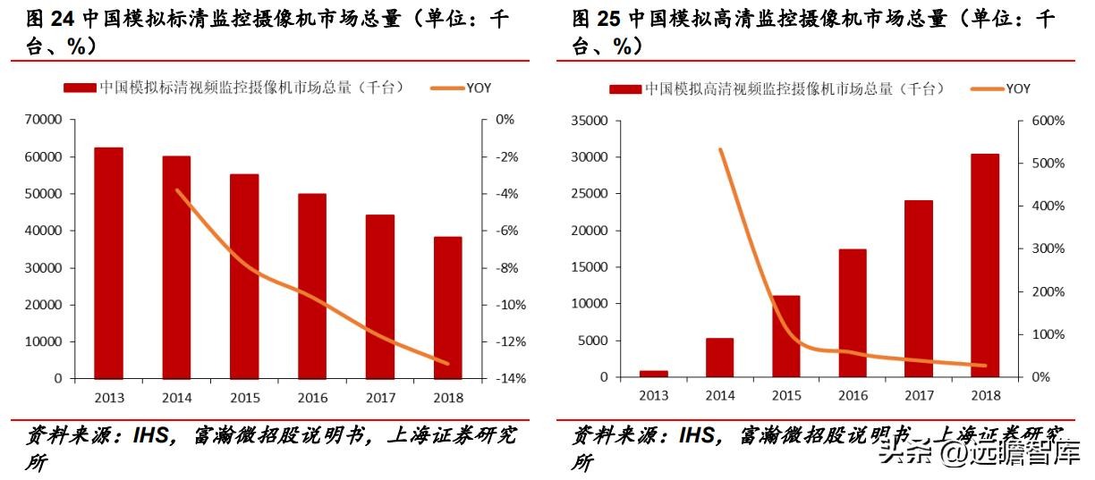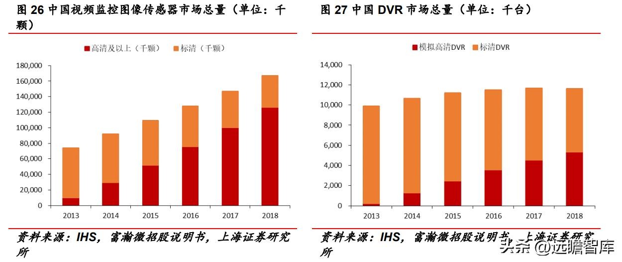 IHS 数据显示,2013-2018年,高清(HD)及以上传感器市场规模从970.92万颗快速上升 至12645.06万颗,年均复合增长率为 67.1%,于 2016年超越逐渐萎缩的标清传感器市场。DVR 市场也呈现类似的高清替代趋势。模拟高清 DVR 市场总量从2013年的22.31万台上升至2018年的 532.43 万台,年均复合增长率为 88.6%,而标清 DVR 市场则持续 缩小。