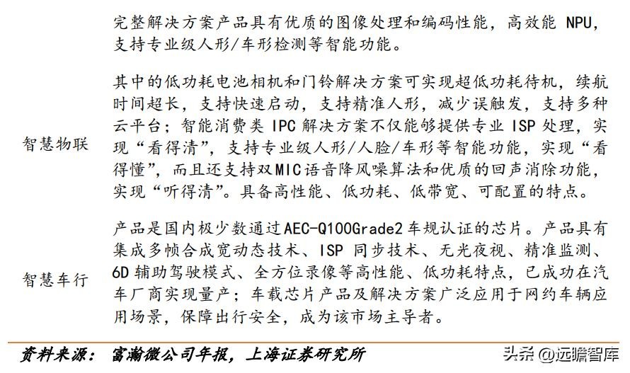 智慧车行业务上,公司拥有专业车规 ISP、模拟视频链路芯片、车载 DVR 芯片,以及一系列车载视频产品及解决方案,包括:智能座舱、驾驶员行为检测、高清环视、行车记录仪、流媒体后视镜、电子后视镜等。