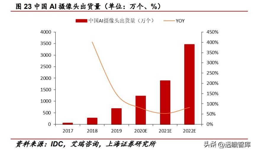 作为智能视频监控设备的主要部件,AI 摄像头市场也在快速增长,拉动对上游芯片的智能化需求。IDC、艾瑞咨询数据显示,2017年我国 AI 摄像头出货量仅为 55 万个,但2022年预计可增长至 3458 万个,年均复合增长率将达到128.9%,增速迅猛。智能摄像头和智能监控设备市场的增长将对上游视频监控多媒体处理芯片行业提出新的要求。