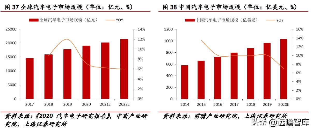 预计到2022年,全球汽车电子市场规模将达到 21399 亿元。前瞻产业研究院指出,中国汽车电子市场规模从2014年的 579 亿美元增长至2019年的 962 亿美元,年均复合增长率为 10.69%,增速稳定。