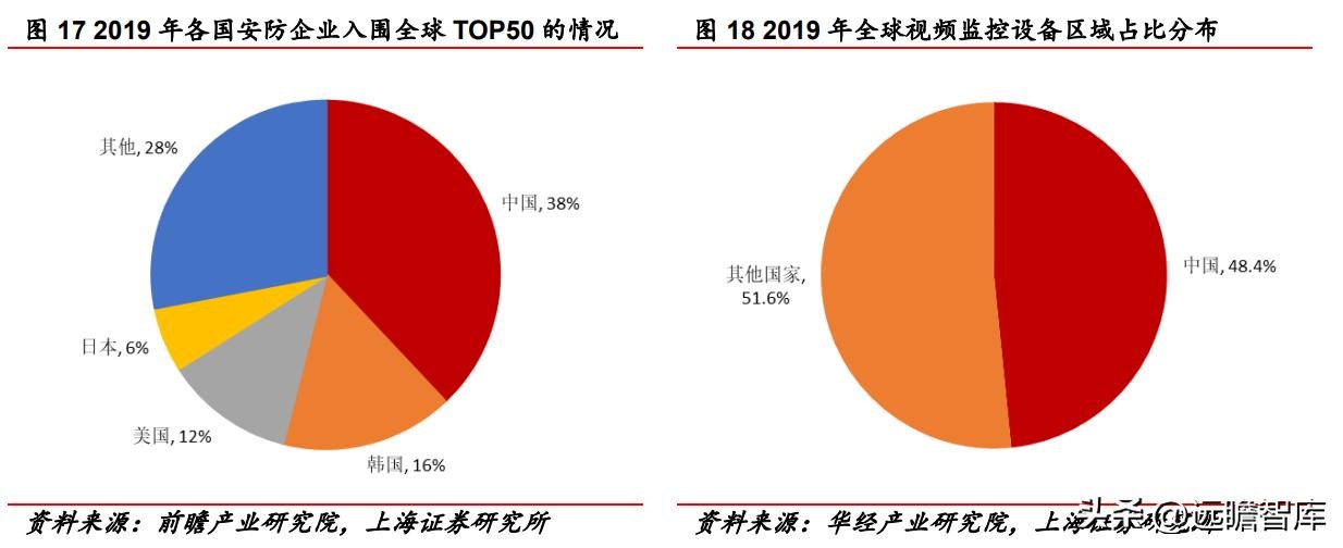 前瞻产业研究院数据显示,2019年在全球安防 TOP50 企业榜单中,中国企业数量排名第一,有 19 家,占据 38%的比重。可见国内安防企业实力雄厚。华经产业研究院指出,从全球视频监控设备区域占比分布来看,我国需求尤为旺盛,是最主要的市场之一,2019年占据全球市场 48.4%的份额。
