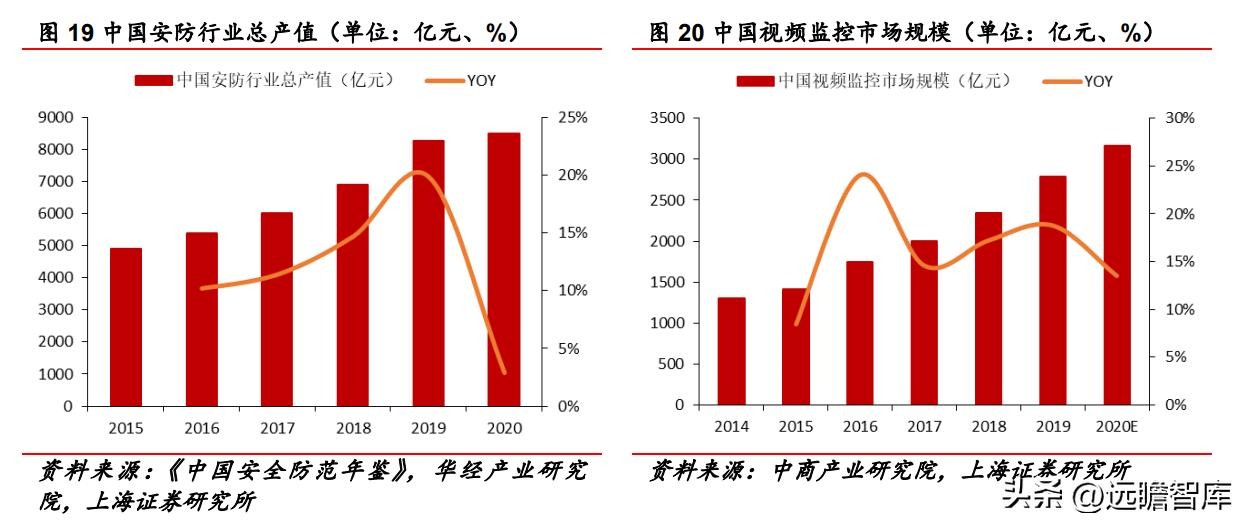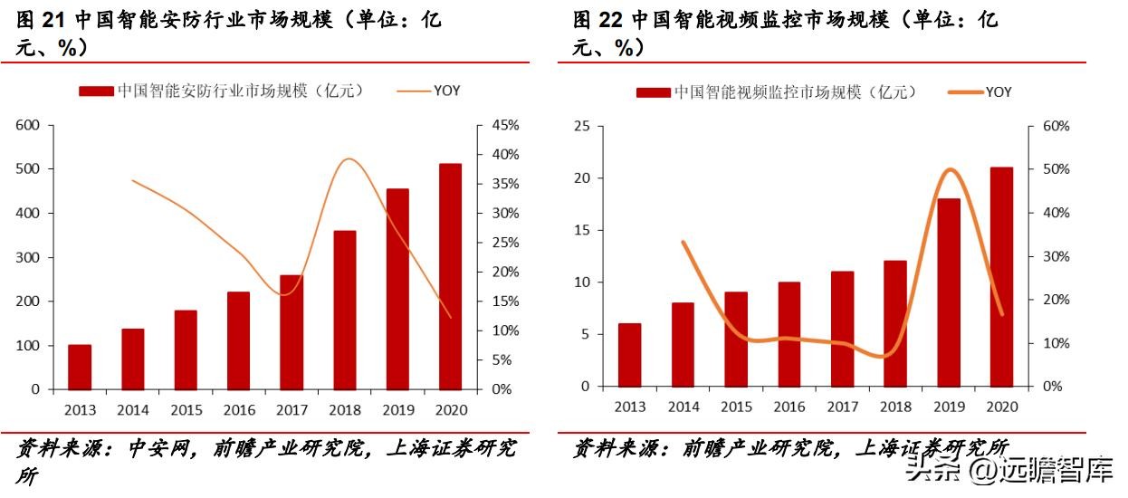 此外,2013-2020年,我国智能视频监控市场规模从 6 亿元增长至 21 亿元,年均复合增长率为 19.6%。