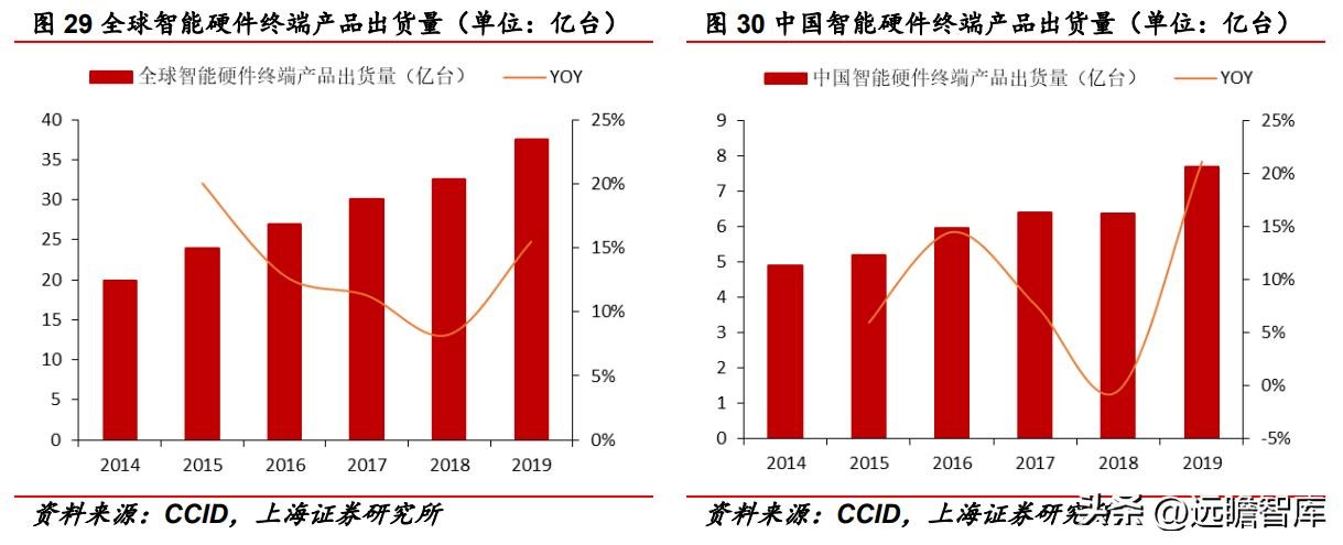 CCID 数据显示,全球智能硬件终端产品出货量呈逐年增长态势,从2014年的 19.91亿台增长至2019年的37.54亿台,年均复合增速达13.5%。