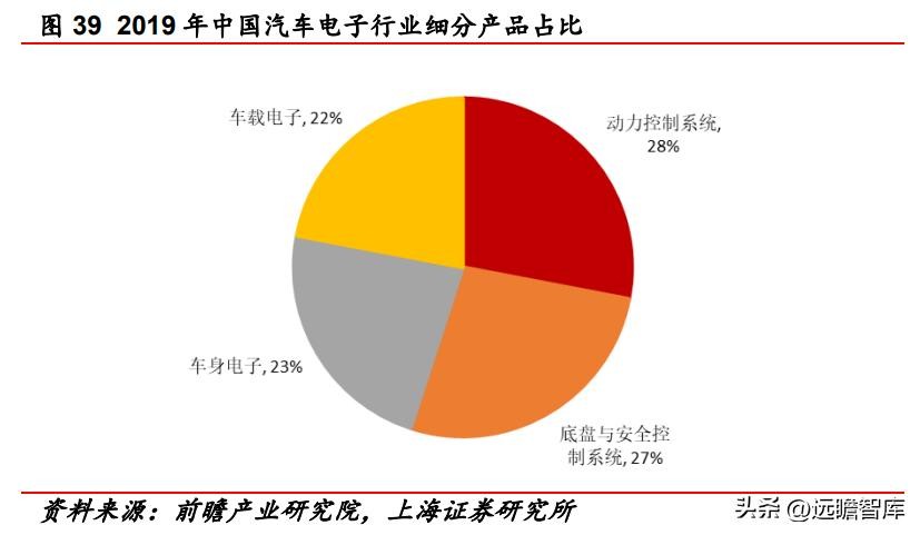 从汽车电子的市场份额分布来看,前瞻产业研究院数据显示,2019年,动力控制系统占国内汽车电子市场份额最大,为28%;其次是底盘与安全控制系统(27%)、车身电子(23%)与车载电子 (22%)。