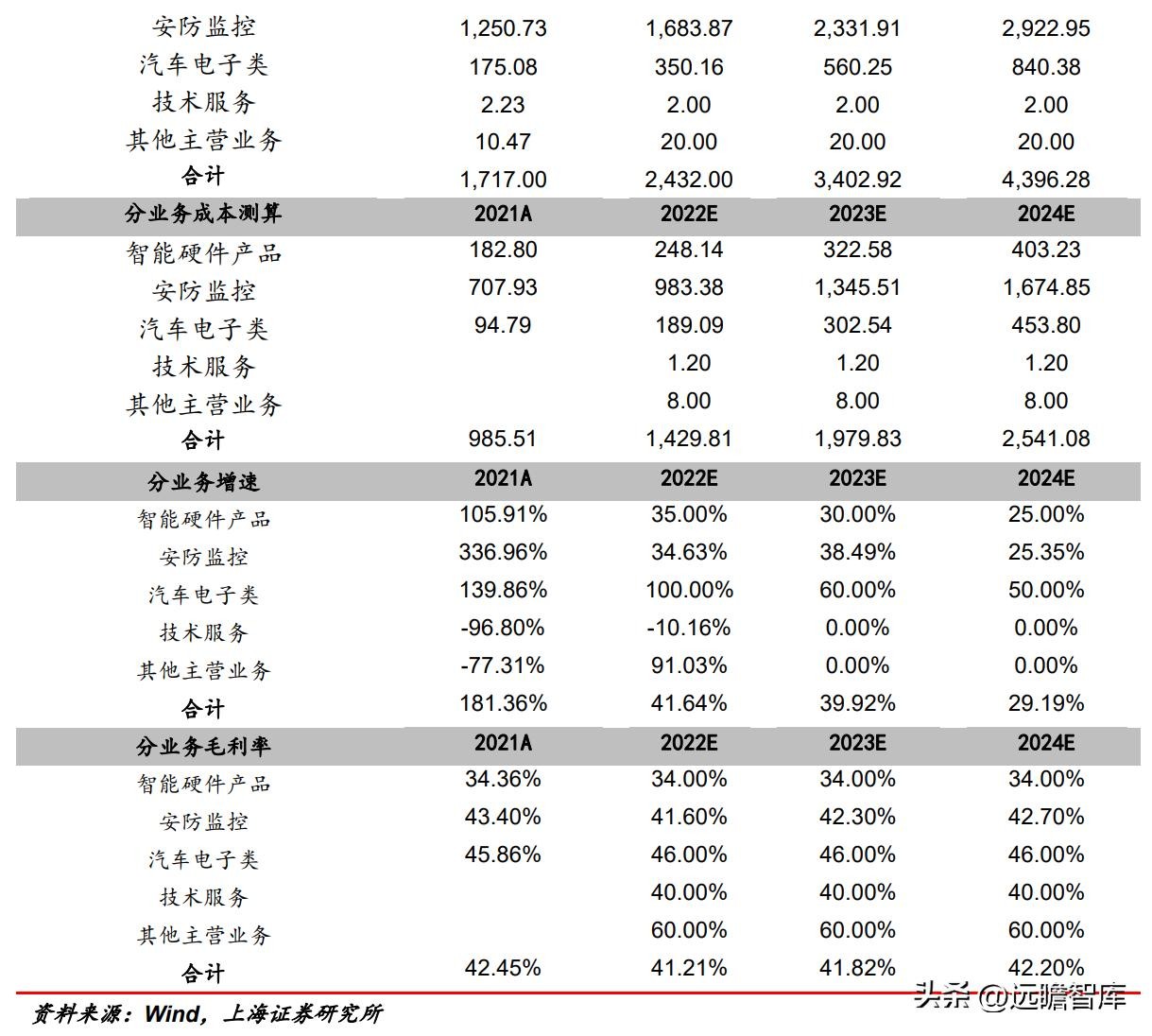 公司汽车电子业务将充分受益于国内智能电动车崛起,21年公司增速高达140%,我们认为未来三年是公司汽车电子继续落地国内品牌车企、方案商客户的关键年份,该业务增速有望保持较快增长。汽车电子业务从后装向前装突破,同时汽车电子产业壁垒较高,我们预计22-24年汽车电子类业务毛利率保持在46%。