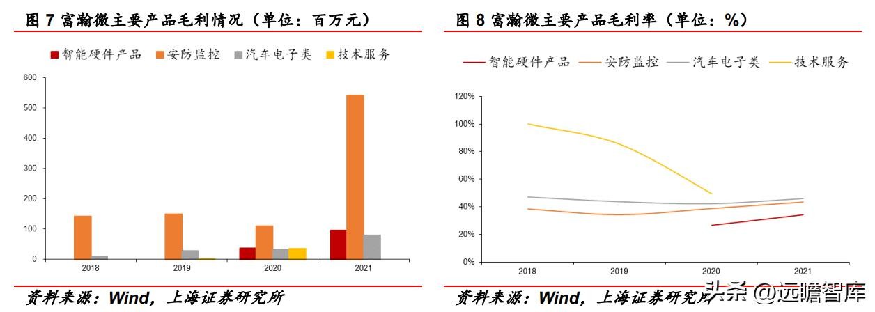 安防监控产品贡献主要毛利。2018-2021年,汽车电子类和安防监控的毛利率变化较小,2021年安防监控毛利迅猛增加。智能硬件产品为公司在2019年之后拓展的新业务,毛利和毛利率都比较低。
