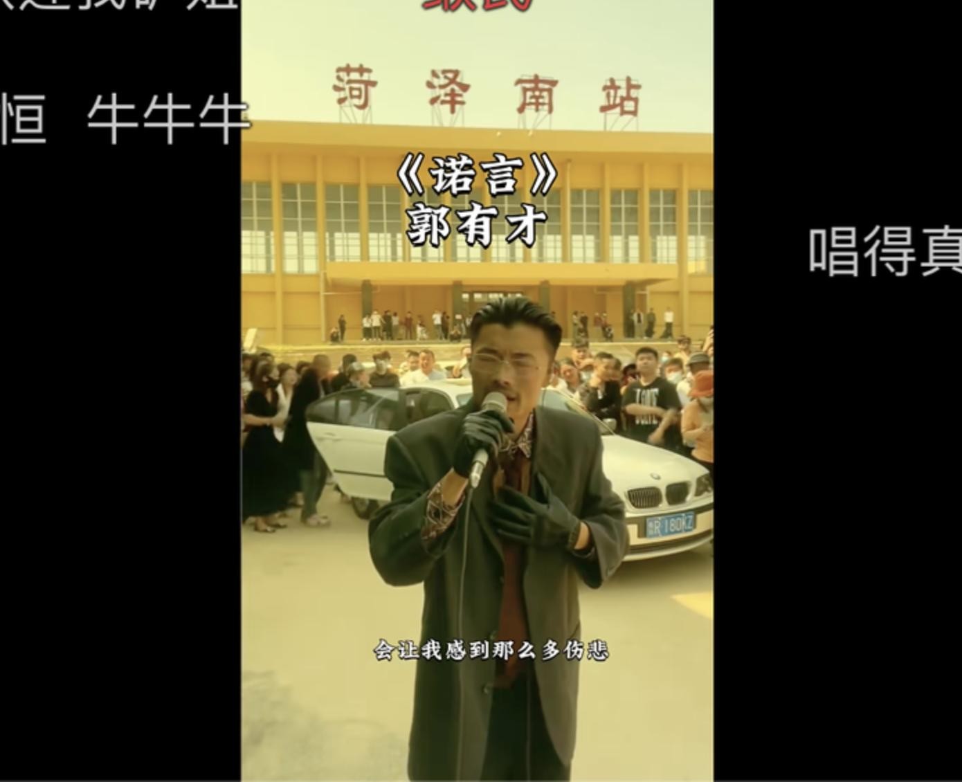 同期火爆的还有山东菏泽的郭有才,他在菏泽南站前翻唱90年代老歌《诺言》,一跃成为10天涨粉千万的现象级网红。梳大背头,戴银边眼镜,穿复古西装,黄调滤镜,郭有才撕心裂肺唱起“你我不能重头,不能停留,不能抗拒命运左右”,或许也是“我不是热爱这里,只是出生在这个地方”的另一种诠释。后来,菏泽南站的直播“乱象”被整改,涌到菏泽南站的主播纷纷散去,小城回归冷清。