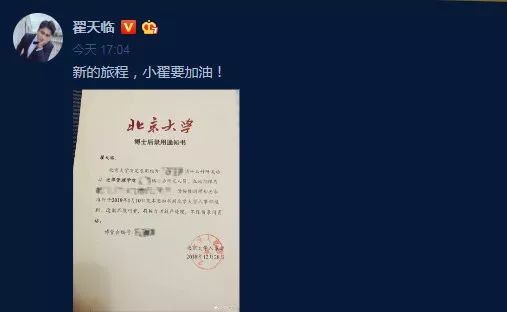 演员翟天临于2018年6月在北京电影学院取得博士学位,2019年1月31日他又在微博晒出北大通知书,将前往北京大学攻读博士后。