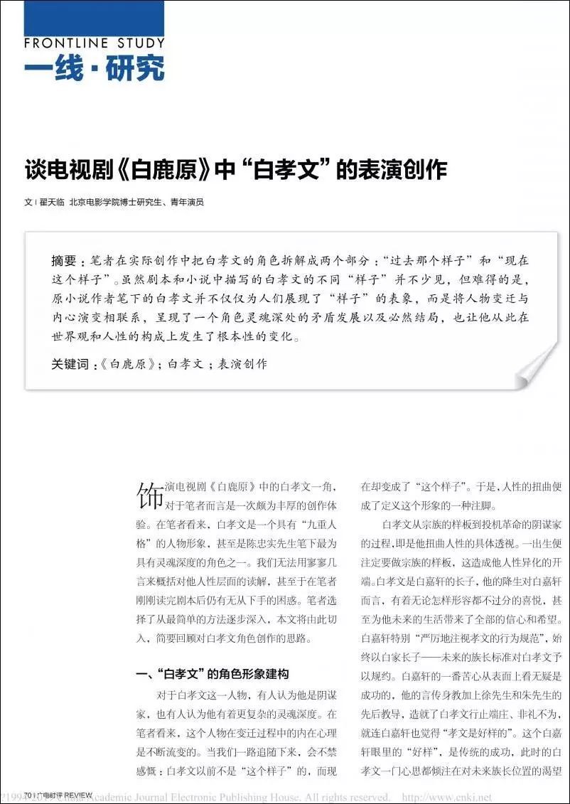 北青报记者从“知网”购买了翟天临的《谈电视剧《白鹿原》中“白孝文”的表演创作》。该文发表于2018年08期的《广电时评》。