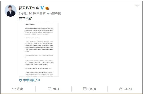 2月8日,翟天临工作室正式发声明,称该言论只是翟天临的幽默反问,其博士学位完全符合北京电影学院要求,2018届博士学位论文预计将于2019年上半年在知网全文公开。