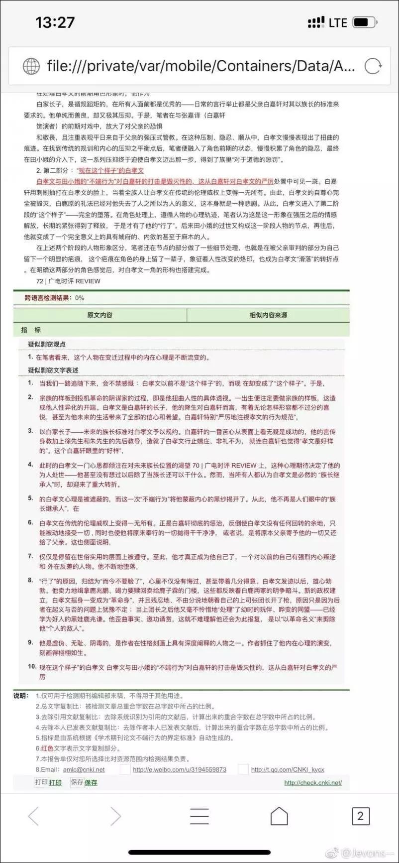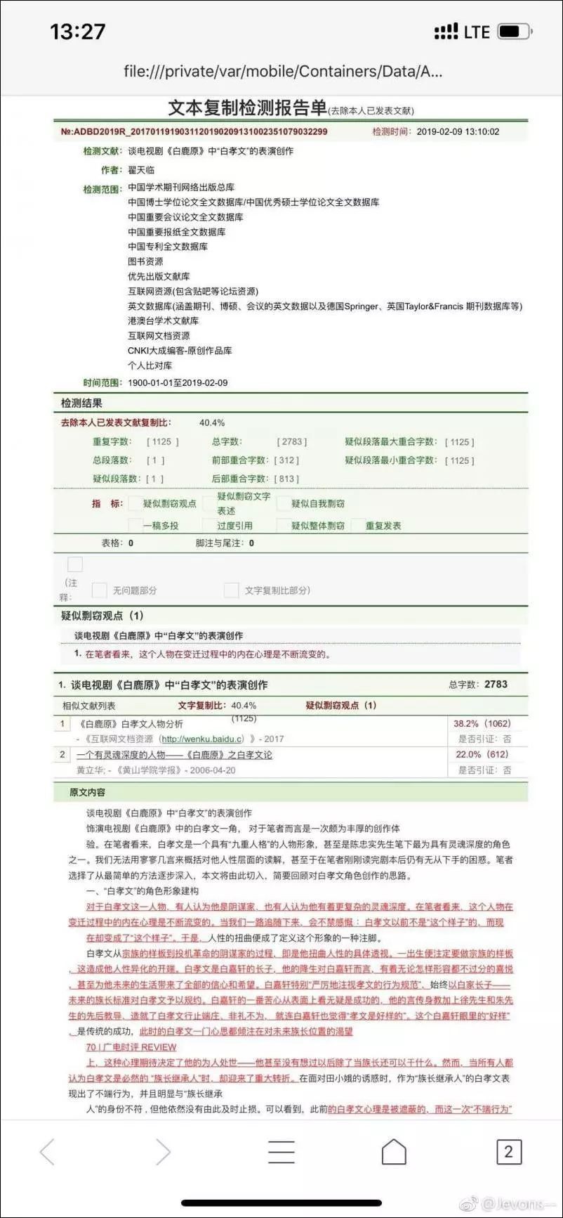 2月9日,有网友在网上曝光了他在知网上查翟天临论文“查重率”的结果图片,这些图片显示,翟天临的论文《谈电视剧<白鹿原>中“白孝文”的表演创作》文字复制比达40.3%,总字数2783的文章中重复字数1125。