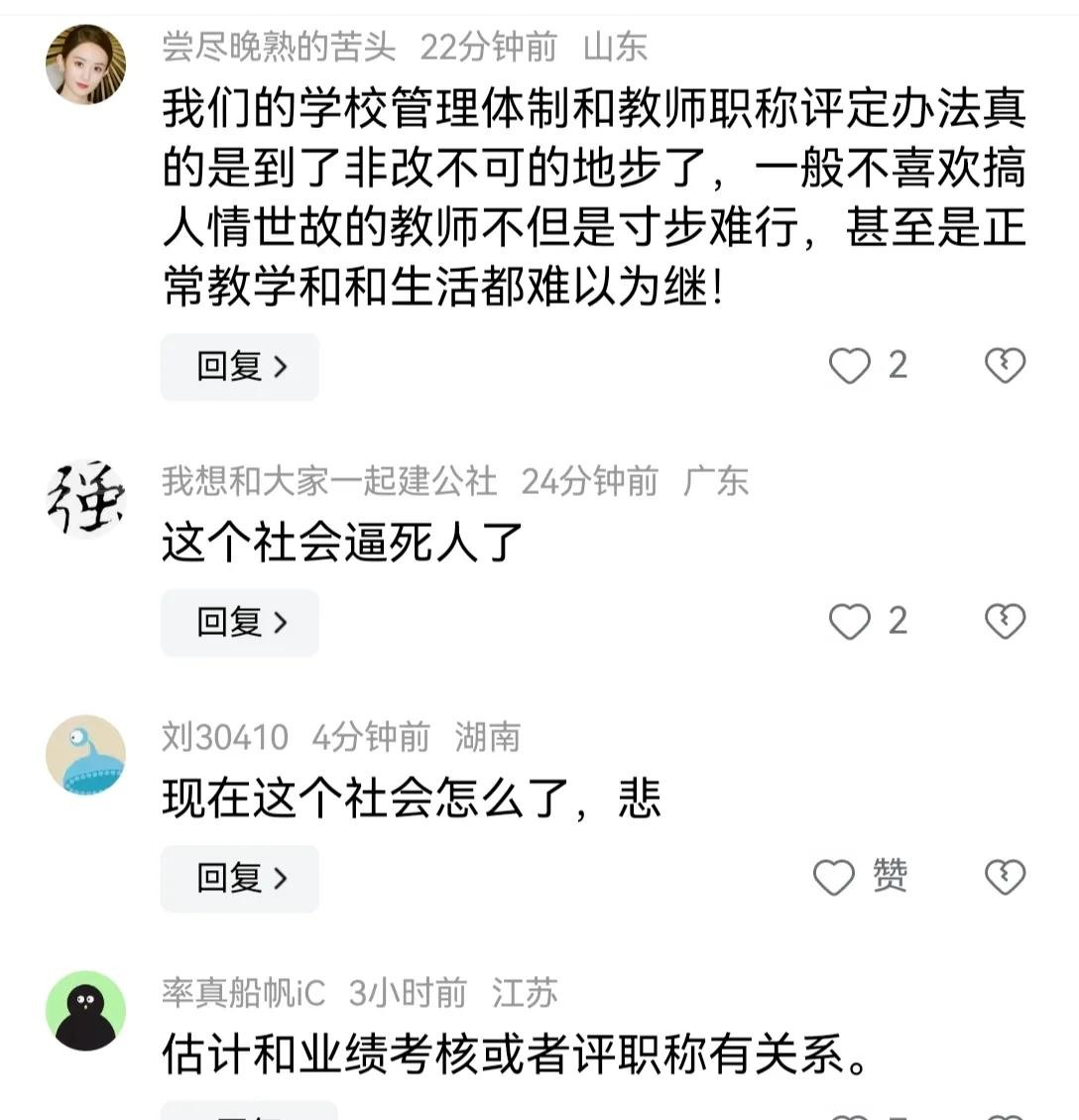 希望大家更多地去关注年轻教师的心理,如果你有孩子正在上学,不要给老师太大压力。毕竟这年头,年轻人活着已经不容易了
