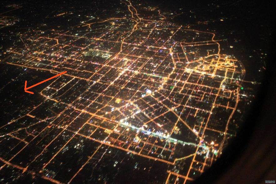 箭头所指为夜晚的汉长安城遗址,对比明显