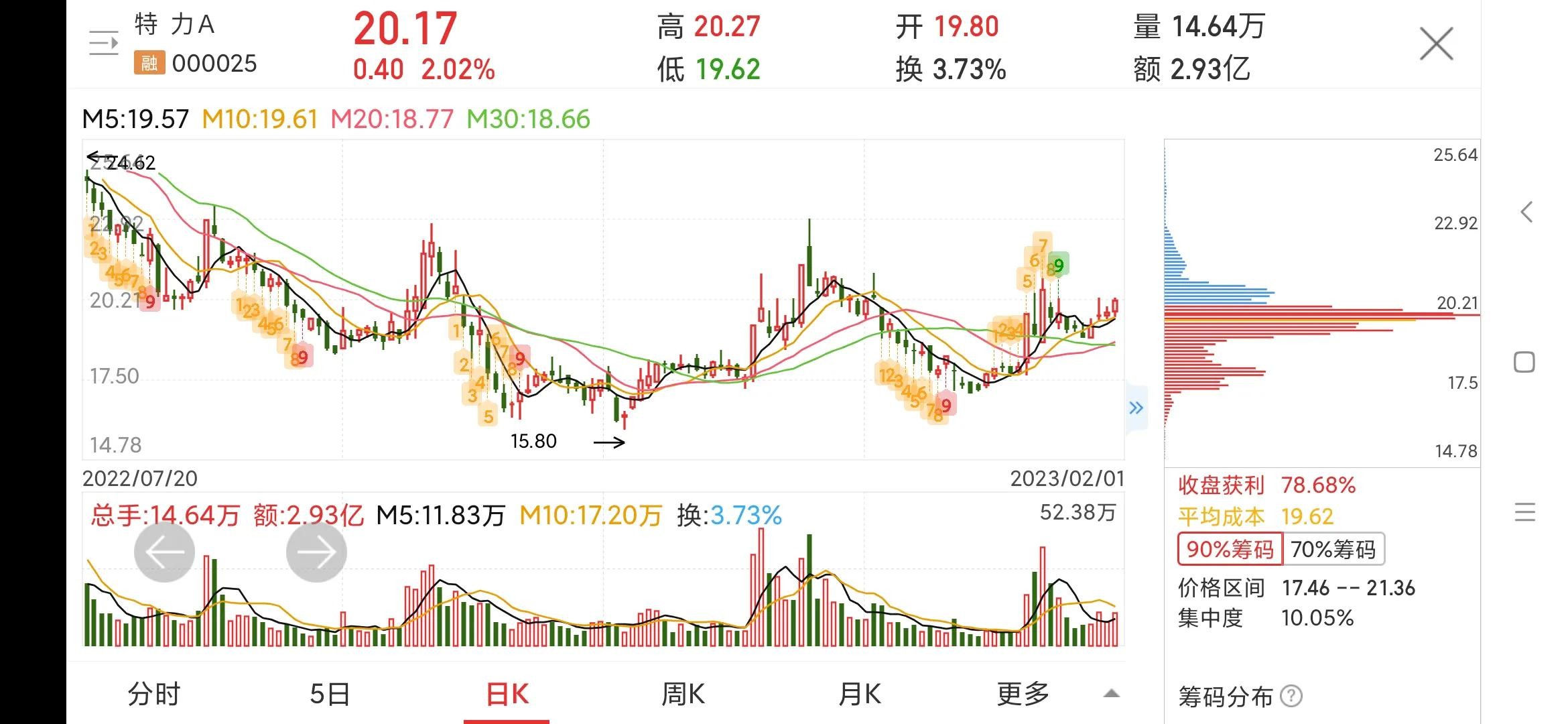 日线,股价处于右边底部大幅震荡阶段,上方强压力位置在23元附近,最近成交量明显放大,人气值比较高。筹码分布显示下方新入大量筹码,下方支撑较强。