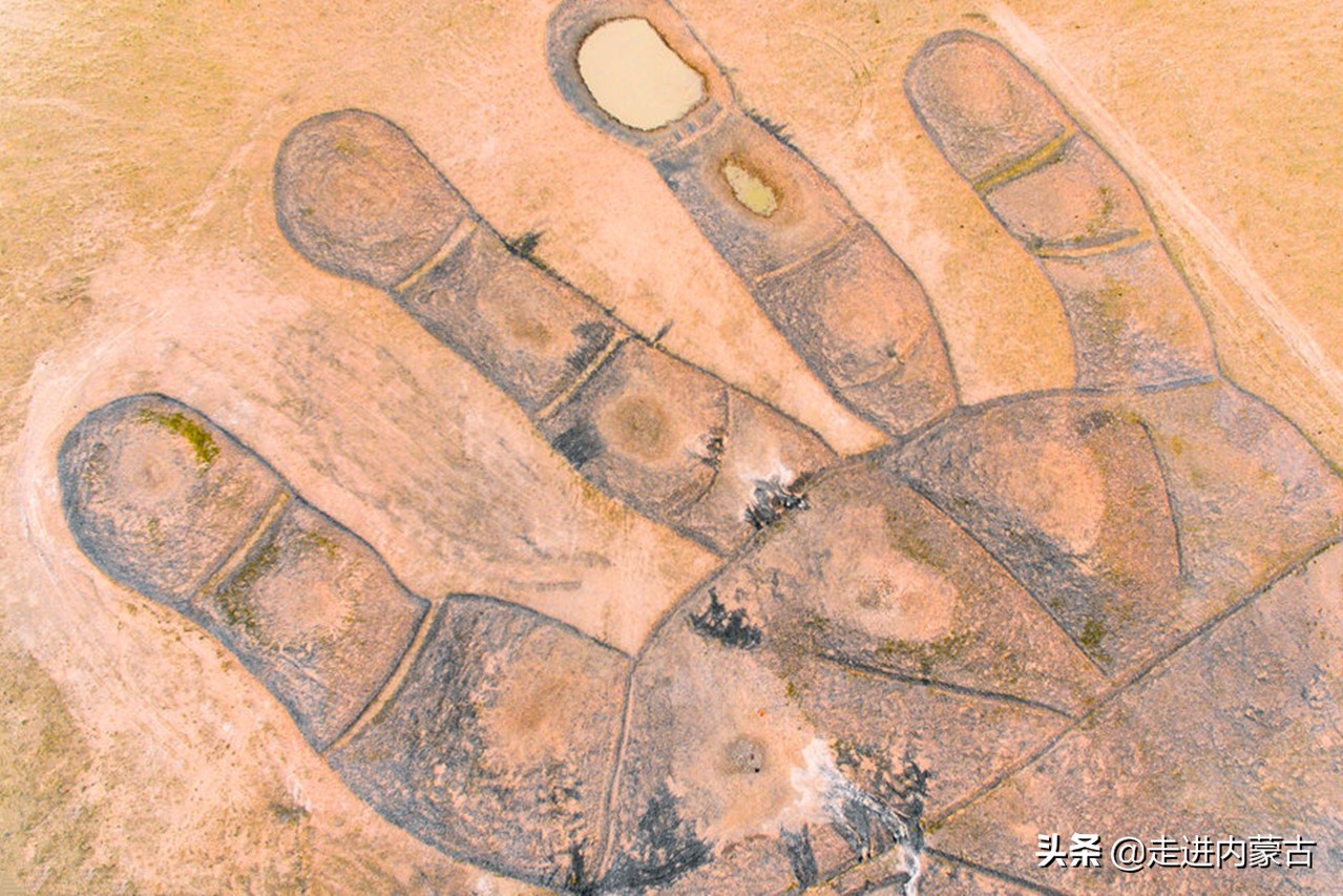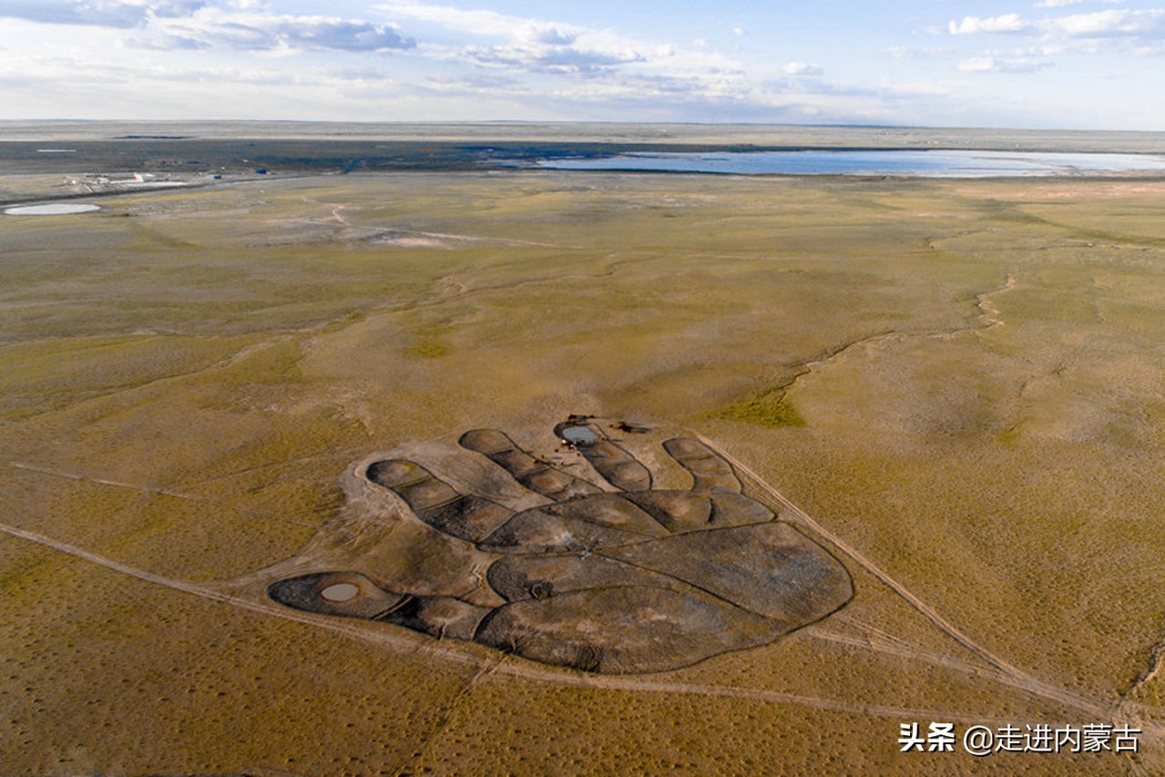 根据查询资料,原来茫茫草原之上的“如来神掌”其实是一件大地艺术作品。占地约4万平方米,相当于6个标准足球场大小,人们也叫它“二连浩特大手印”。