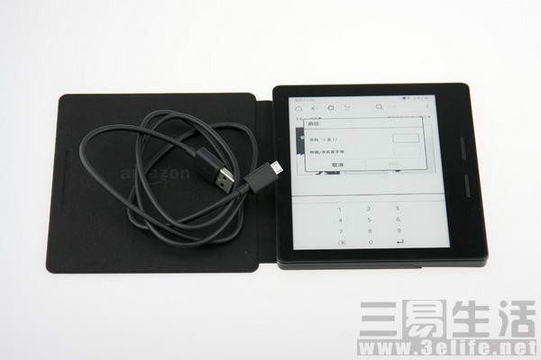 取出包装内容物:阅读器、充电/数据线、还有就是这次颇为亮眼的皮质充电保护套。亚马逊没有为Kindle Oasis配备充电头,事实上也完全没有必要——至于为什么,我们后面会为大家揭示。