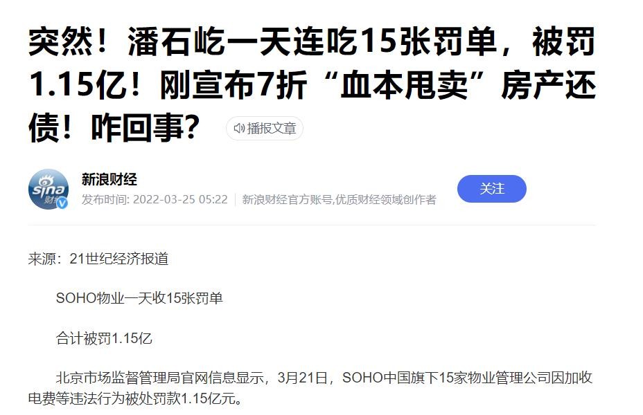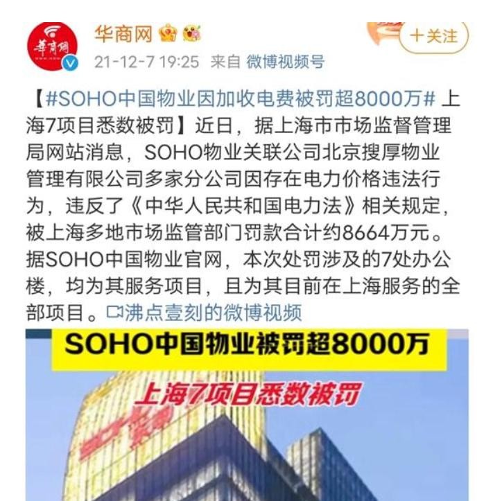 2022年3月21日,北京市场监督管理局发布消息,SOHO中国旗下的物业公司,因加收电费等违法行为被罚款1.15亿元。