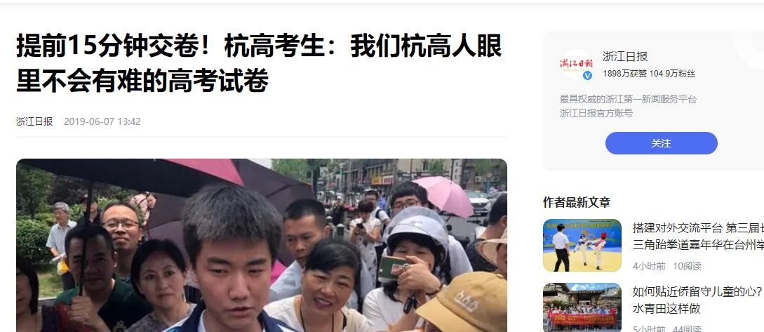 浙江日报 提前15分钟交卷!杭高考生:我们杭高人眼里不会有难的高考试卷