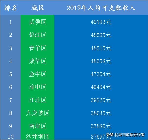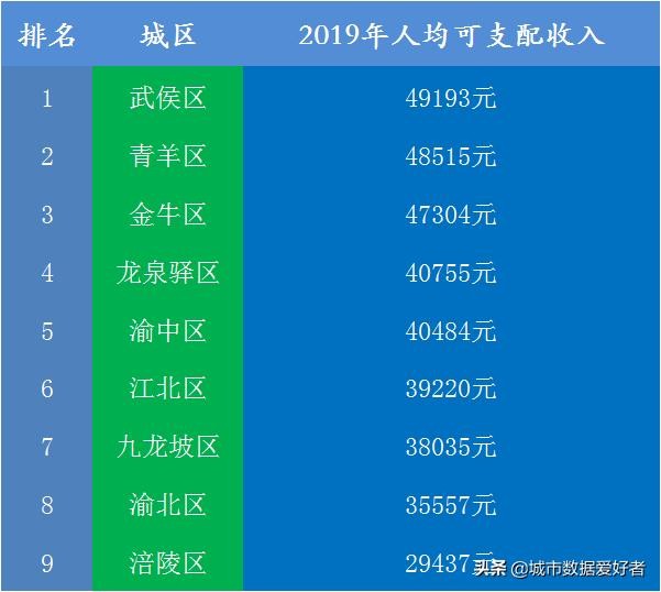以上只是GDP的一个对比,再来看看人均可支配收入,咱们先给成都、重庆GDP最强的十个区的人均可支配收入进行一下排名: