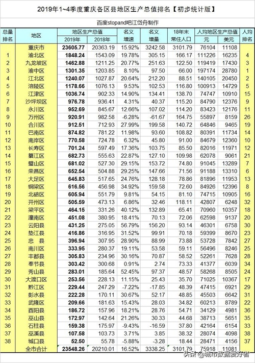 于是乎,在这里小编就不这样直接比较两座城市的经济水平了,咱们先来看2019年重庆各区县的GDP: