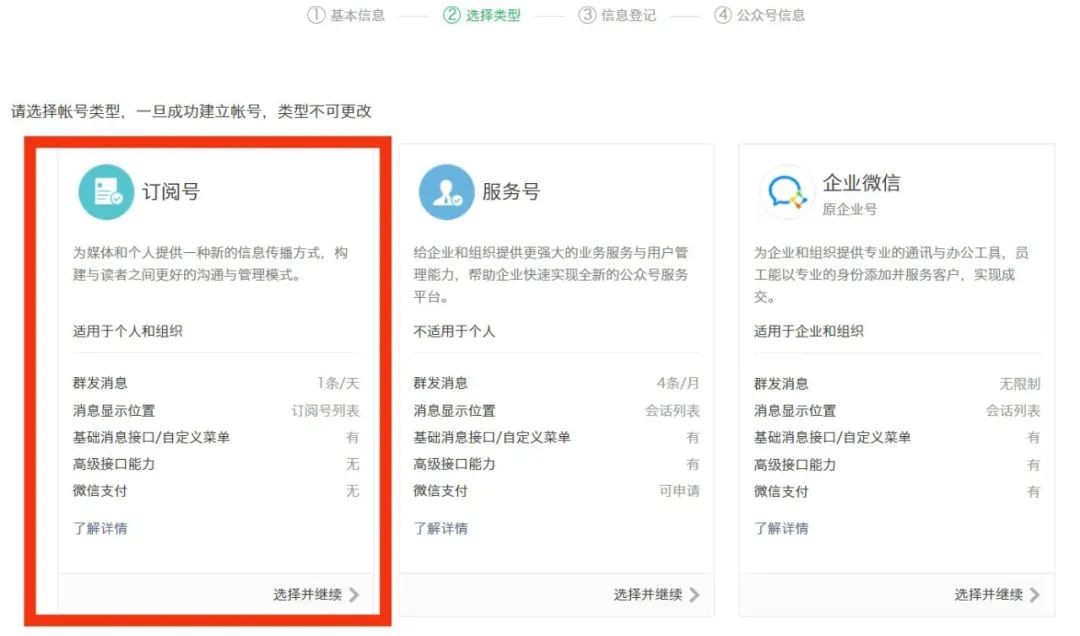 仔细看3种类型适用的账号,【服务号】与【企业微信】都是为企业或组织准备。
