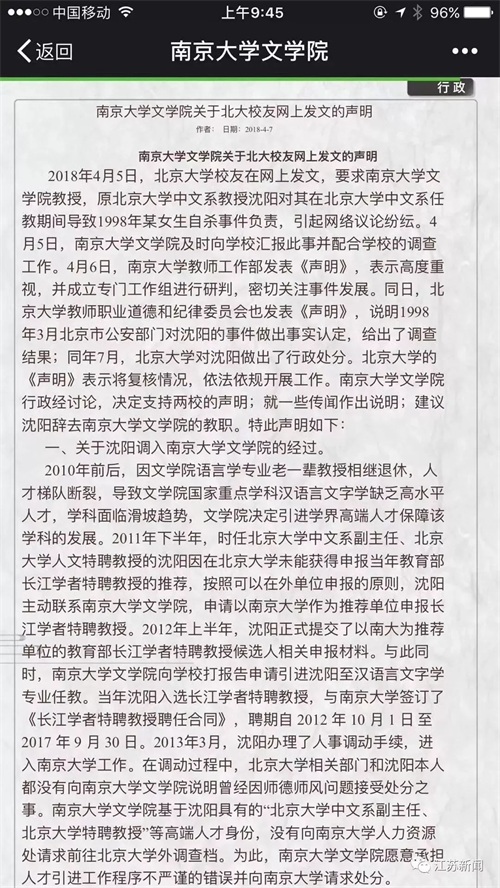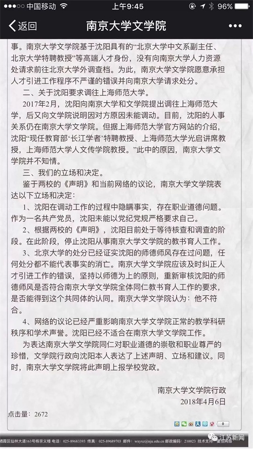 4月6日,南京大学文学院发布声明,建议沈阳辞去南京大学文学院的教职。