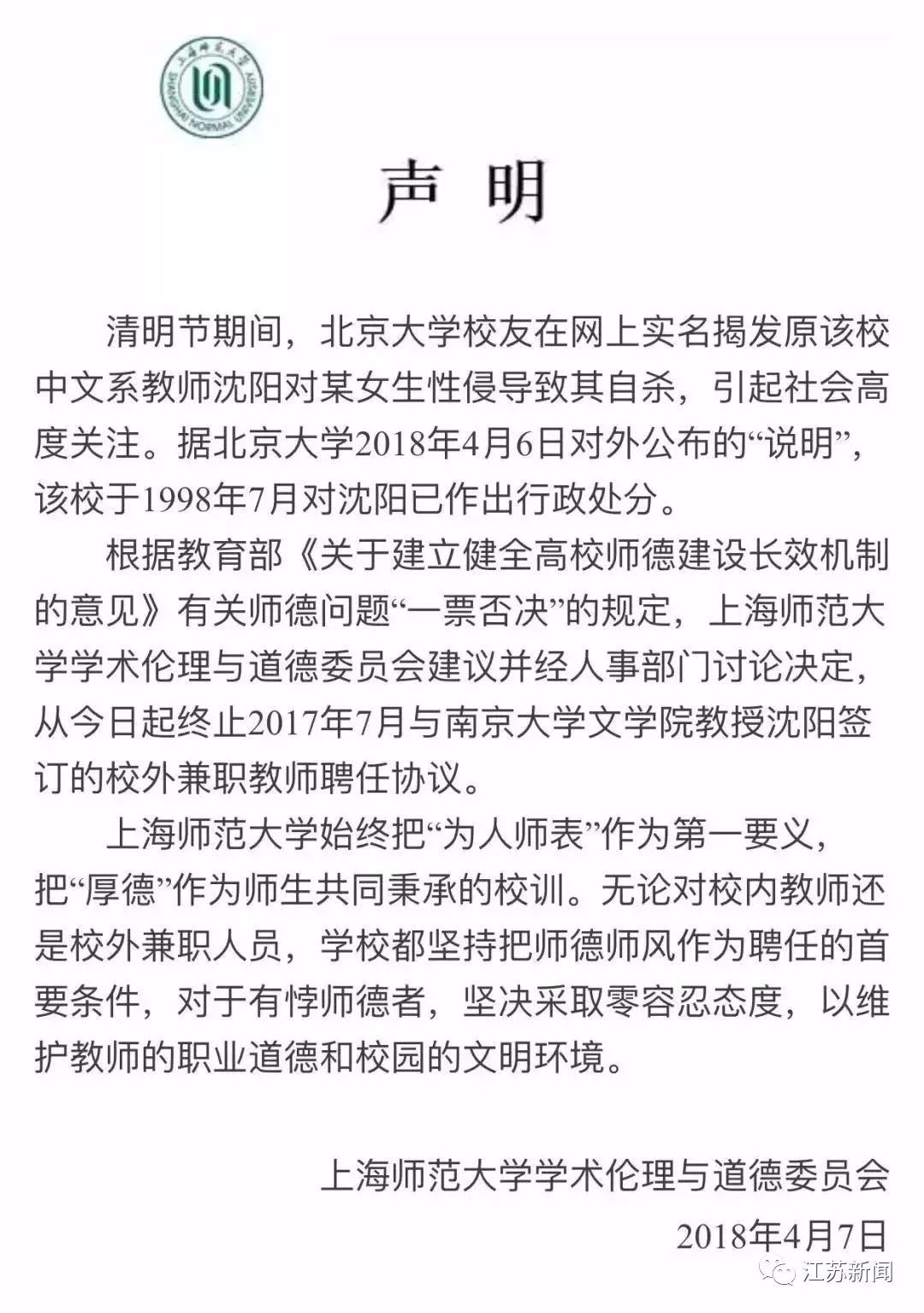 4月7日,上海师范大学发文,根据教育部《关于建立健全高校师德建设长效机制的意见》有关师德问题“一票否决”的规定,上海师范大学学术伦理与道德委员会建议并经人事部门讨论决定,即日起终止2017年7月与南京大学文学院教授沈阳签订的校外兼职教师聘任协议。
