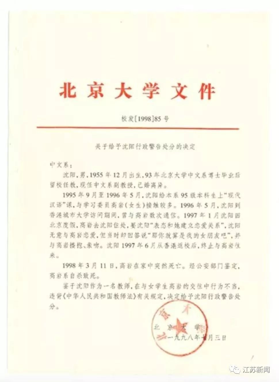 1998年3月,北京市公安局西城分局做出事实认定,其中涉及沈阳行为不当、违反师德。北京大学作出决定,鉴于沈阳作为一名教师,在与女学生高岩的交往中行为不当,违反《中华人民共和国教师法》有关规定,决定给予沈阳行政警告处分。