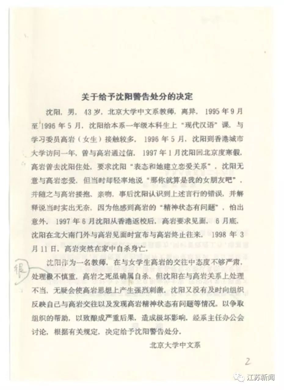 沈阳作为一名教师,在与女学生高岩的交往中态度不够严肃,处理极(后改为很)不慎重,高岩之死虽确属自杀,但沈阳在与高岩关系上处理不当,无疑会使高岩思想上产生强烈刺激,沈阳又没有及时向组织反映自己与高岩交往以及发现高岩精神状态有问题等情况,以争取组织的帮助,以致酿成严重后果,造成极坏影响,经系主任办公会讨论,根据有关规定,决定给予沈阳警告处分。