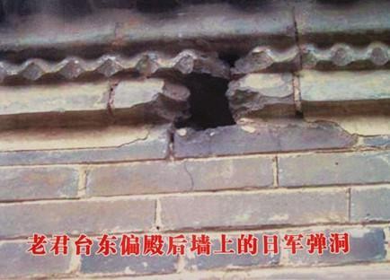 老君台大殿东墙、东偏殿后墙和柏树上共中炮弹十二发,有一发打在了老君台的西侧。其中有两发炮弹穿透大殿山墙,一发卡在了大殿内西边的梁架上,一发落在了老君像前的神龛上。当时大殿后边还有两间小殿,是老君炼丹房,房内存放了满满一屋子的黑色炸药,这些炮弹如果有一发爆炸,引起炸药爆炸,其后果不堪设想。