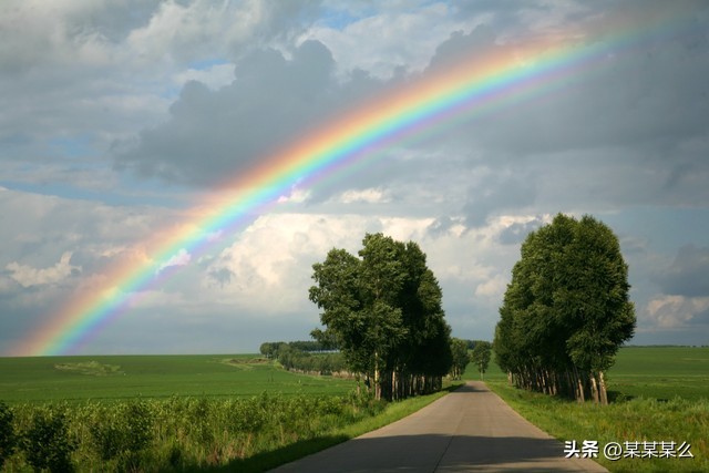 彩虹是由于太阳光经过大气层中的水滴后被散射所形成的。由于不同颜色的光波长不同,经过水滴后会被不同程度地折射和反射,使得不同颜色的光线形成不同的角度,从而产生了红、橙、黄、绿、蓝、靛和紫七种颜色的分布。