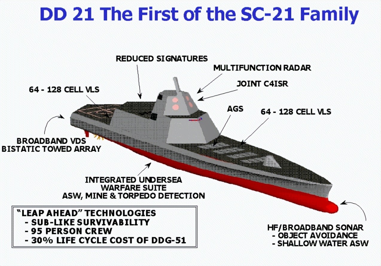 对于这样的军舰,美国海军高层内部也是褒贬不一,两方人马各自陈述利弊,一时半会居然分不出来个胜负。但是1996年,一直很支持发展单一功能武库舰的布尔达上将突然自杀了,接替他的杰伊-约翰逊则是个“多用途派”。他认为美国海军不需要一艘只能打导弹的武库舰,一艘综合性的军舰才是真正有前途的东西。于是,武库舰的未来几乎被判了死刑,多用途的DD-21项目正式登场。DD-21项目的发展模式与以往不同,这次是美国海军提出性能需求,然后由企业拿出设计方案参与角逐。项目预算包含了军舰的前期设计,后期的建造、维护、升级甚至是报废处理。毫无疑问,DD-21项目一开始的预算原则还是明确的:少花点钱,多办点事。