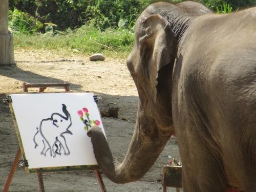 我们都知道大象的鼻腔里有很多神经末梢,把棍子抵在它的鼻子里其实是非常痛苦的。光想想核桃就觉得疼了。但相比于被象钩刺,揭旧伤等,这种痛它们还能咬牙忍受。但是学画画肯定不是一次两次就成功的,在这过程中,一旦它们画错了,驯象师还会用象钩狠狠的教训它们。就这样,聪明的大象在数月的折磨中,学会忍住画笔带来的疼痛,能画出小树、画出小花,甚至画出自己了。