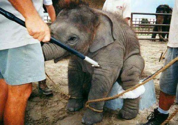 就这样,不断用尖锐的象钩去刺小象,使它们保持清醒,直到它们的身体虚弱到无法站立,精神也极度崩溃之时,才会给它们一点点食物,然后再骑在它背上,开始进一步的“训练”。就拿玛丽的大象游行来说,训练员骑在大象身上这么一个简单的事情对于大象来说却是痛苦的。可能有人会觉得大象的力气这么大,驼一两个人不是轻轻松松的吗?不是的。