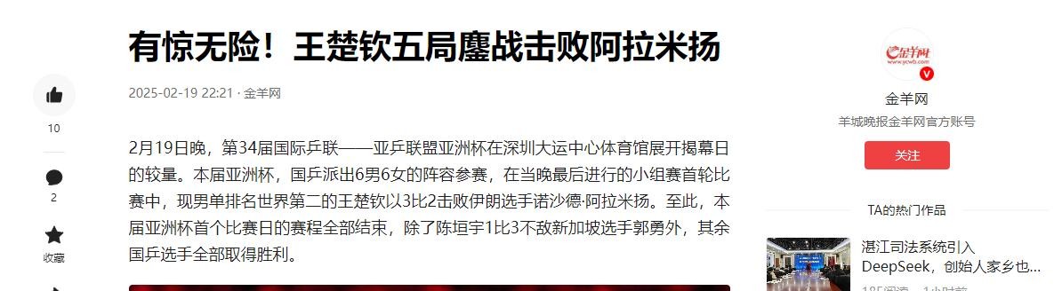2月19日晚,深圳大运中心,大头王楚钦与伊朗名将阿拉米扬男单首战,硬是打出了生死对决的既视感。