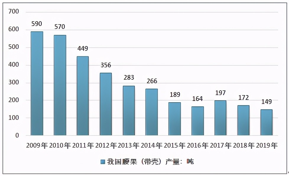 近年来受腰果种植业经济效益低下的影响,我国腰果主产区海南省主要企业及农户已经基本退出腰果种植领域。2000年时海南省腰果种植面积达到5272公顷,到2019年种植面积仅剩零头2公顷。海南省腰果(带壳)产量从2000年的1177吨降至2019年的40余吨,其中2017与2018年出现绝收情况。据FAO统计数据:我国腰果产量从2009年的590吨下降至2019年的149吨。