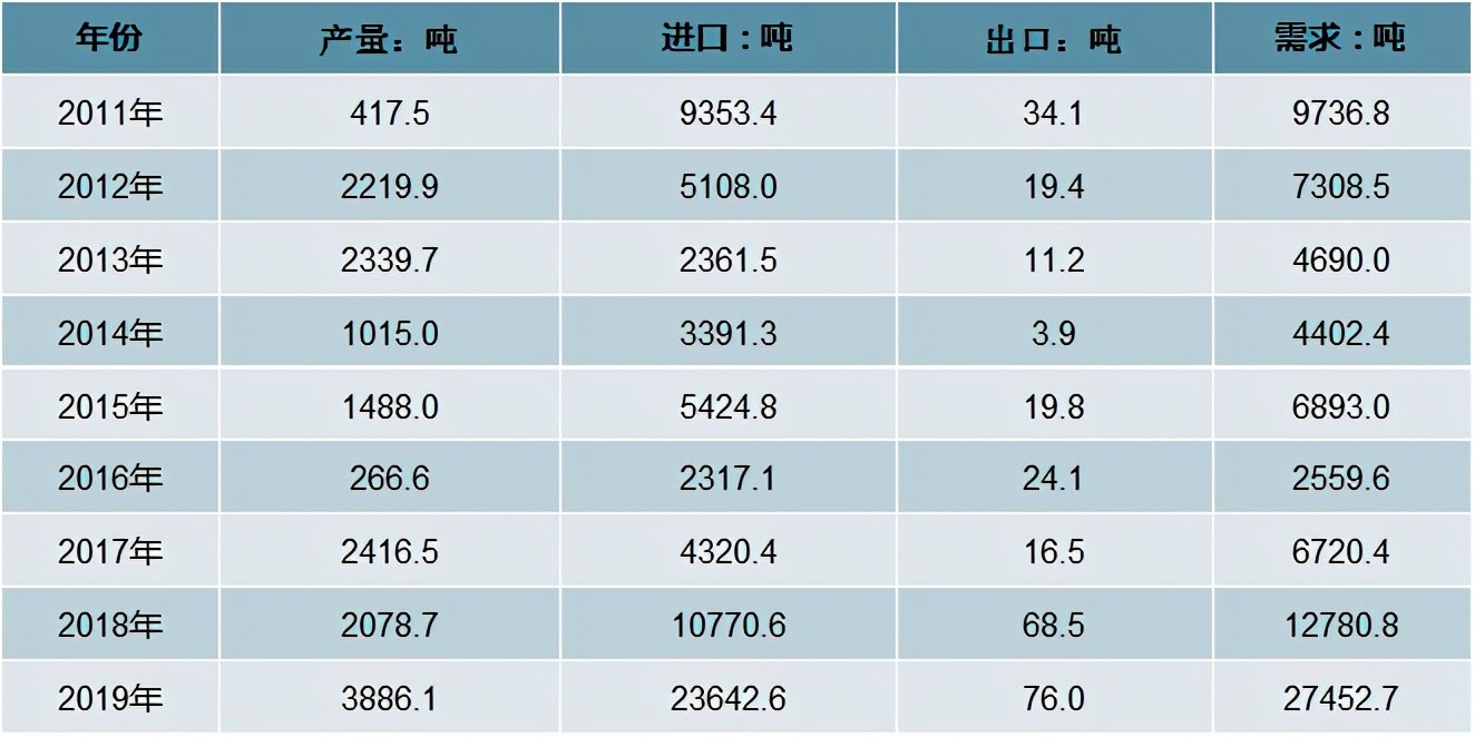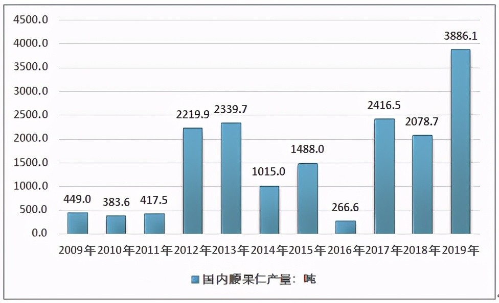 根据业界经验,腰果(带壳)出仁率大致在30%左右,按照100%的加工率、30%的出仁率测算:2018年我国腰果仁产量为2078.7吨,2019年我国腰果仁产量为3886.1吨。