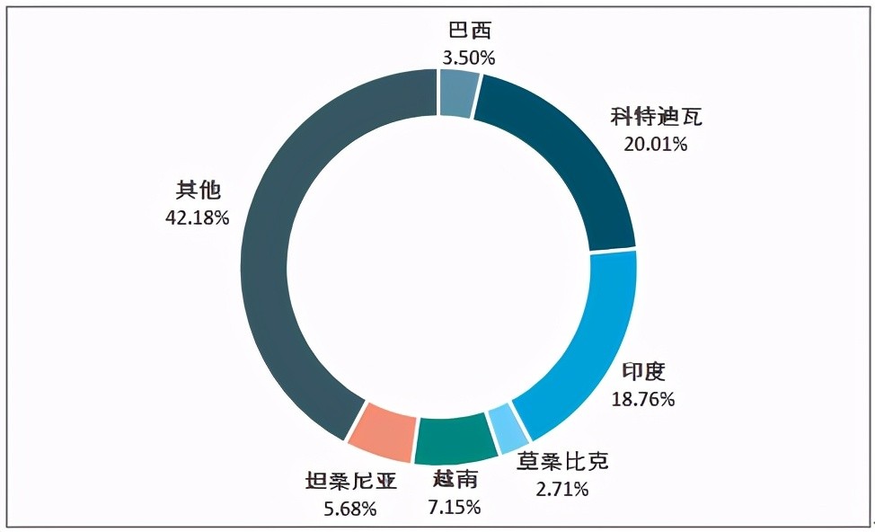 科特迪瓦腰果产量为79.30万吨,占全球总产量的20.01%;巴西腰果产量为13.88万吨,占比为3.50%;印度腰果产量为74.30万吨,占比为18.76%;莫桑比克腰果产量为10.71万吨,占比为5.68%;越南腰果产量为28.33万吨,占比为7.15%;坦桑尼亚腰果产量为22.51万吨,占比为5.68%。