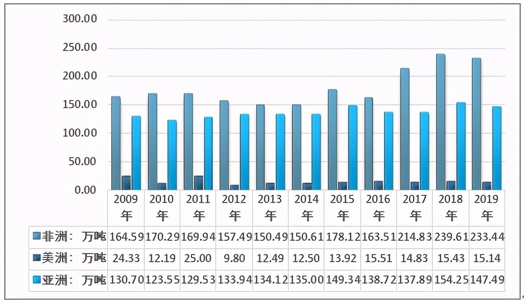 2019年以科特迪瓦、莫桑比克为代表的非洲地区腰果产量为233.44万吨;以印度、越南为主的亚洲地区产量为147.49万吨;以巴西为主的美洲地区腰果产量为15.14万吨。