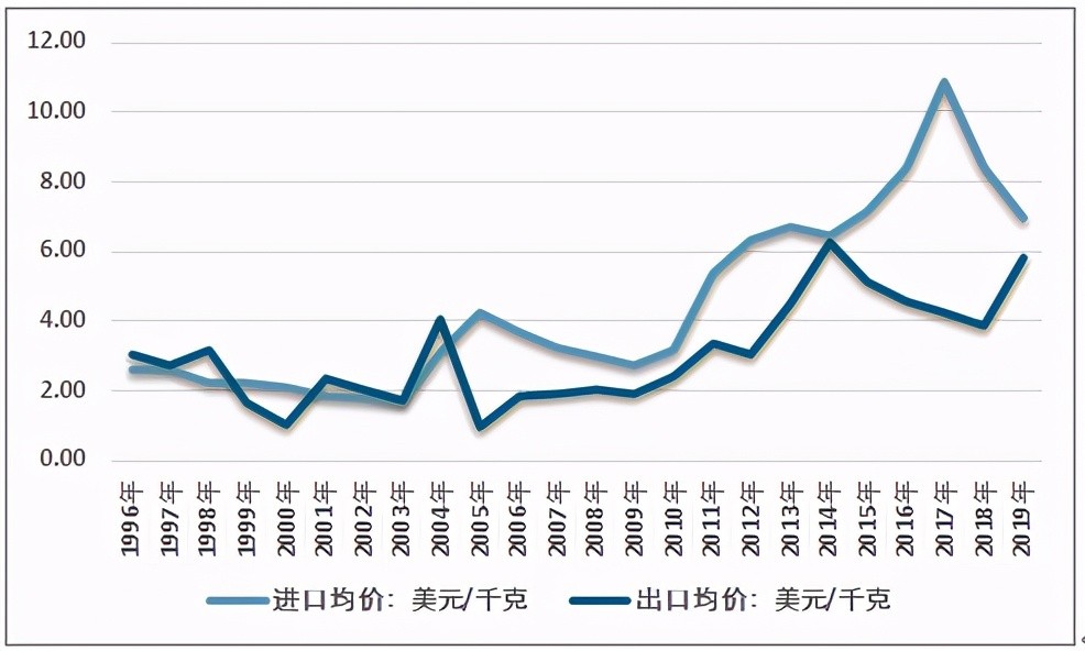 根据海关统计2019年我国腰果仁进口数量为2.36万吨,进口数量同比增长119.51%;进口金额为16537.61万美元,进口金额同比增长81.82%;2019年我国腰果仁进口均价为6.99美元/千克,进口均价同比下降17.17%。