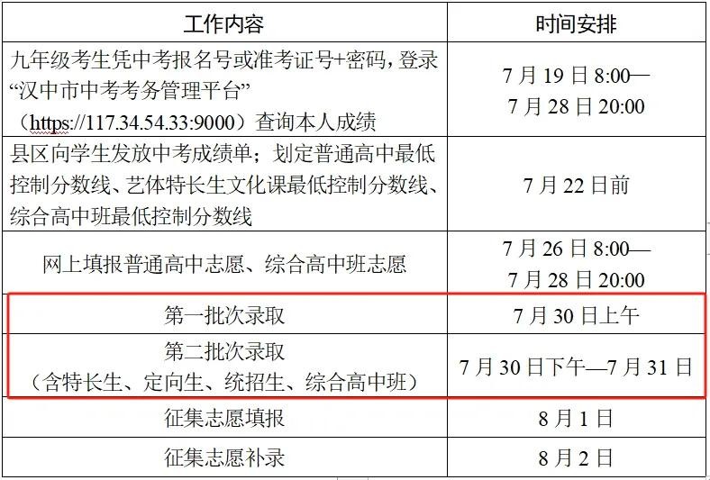 第一批次录取7月30日上午第二批次录取(含特长生、定向生、统招生、综合高中班)7月30日下午-31日
