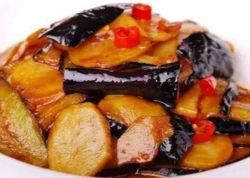 四、锅中留有少量的油,葱、姜、蒜爆香,将滑过油的茄子段、土豆、放入锅中煸炒,加生抽、老抽、蚝油、白糖、食用盐、胡椒粉、鸡精、快速翻炒入味出锅,装盘即可。
