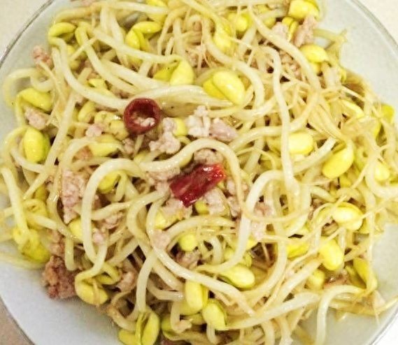 三、锅中放油,葱、姜、蒜、干辣椒爆香,放入肉末煸炒出香味,再放入焯过水的黄豆芽,加生抽、胡椒粉,食用盐,煸炒入味出锅,装盘即可。