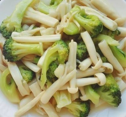 四、锅中放油,葱、姜、蒜爆香,放入肉末煸炒,再放入焯过水的西兰花、海鲜菇,加料酒、食用盐、胡椒粉、鸡精,快速翻炒,出锅装盘即可。
