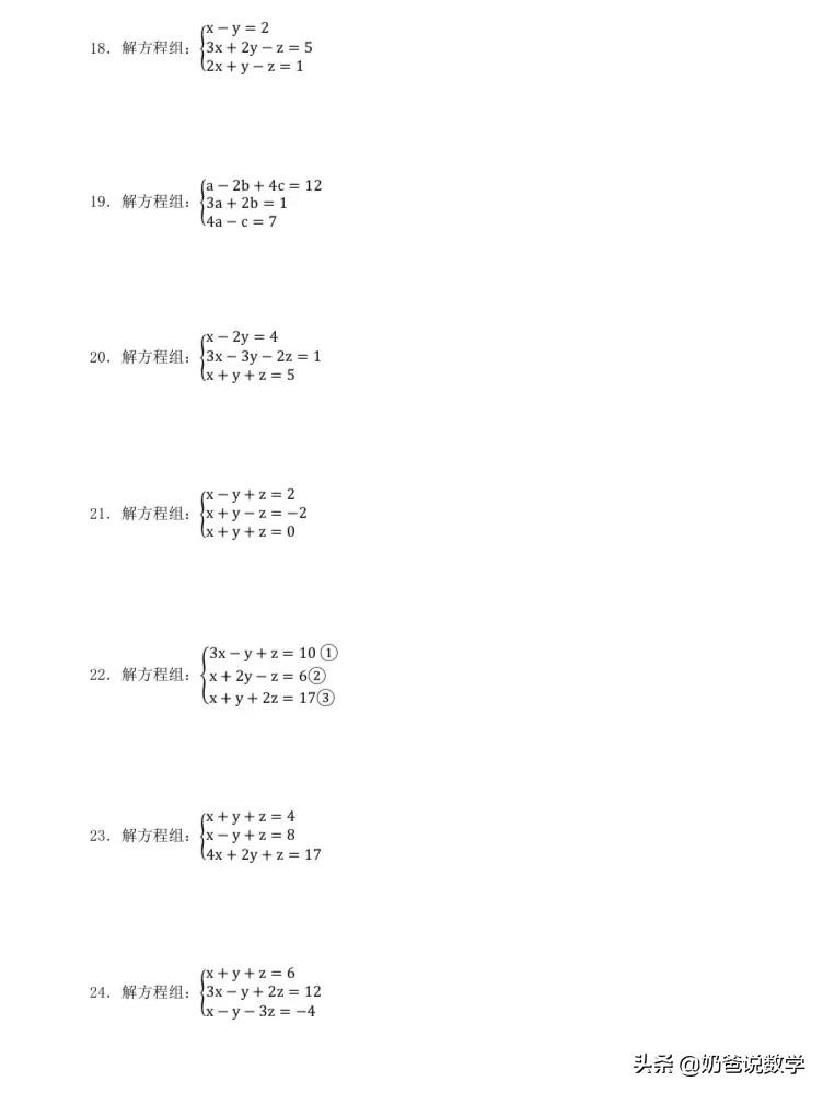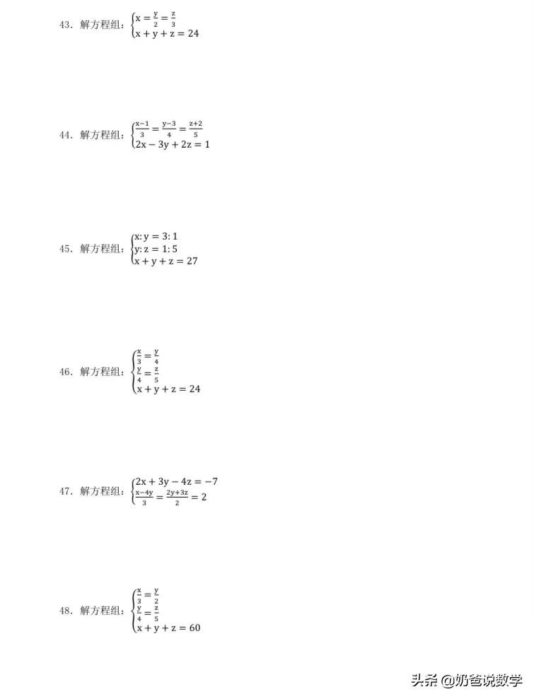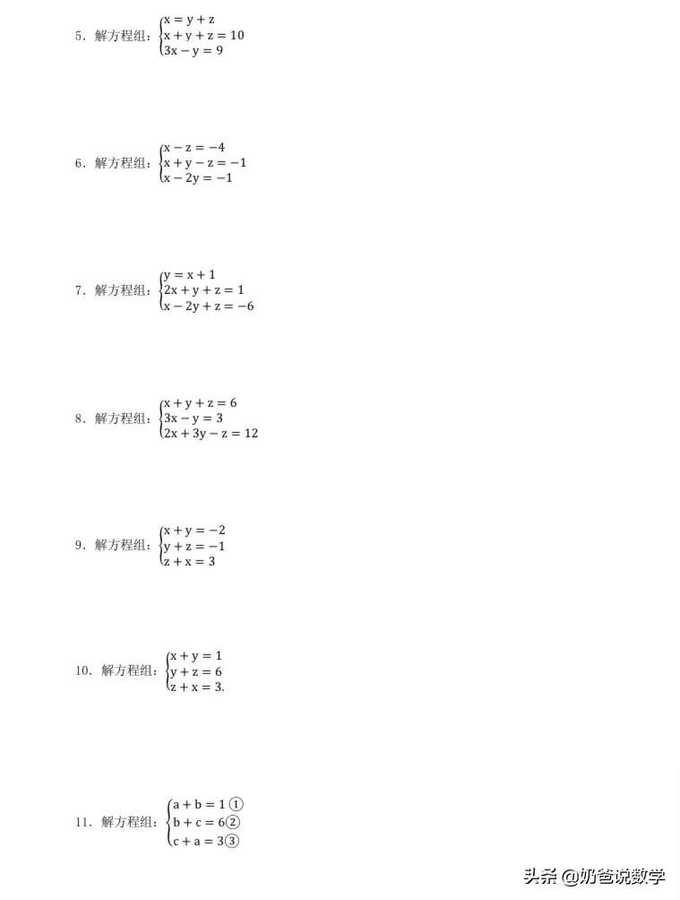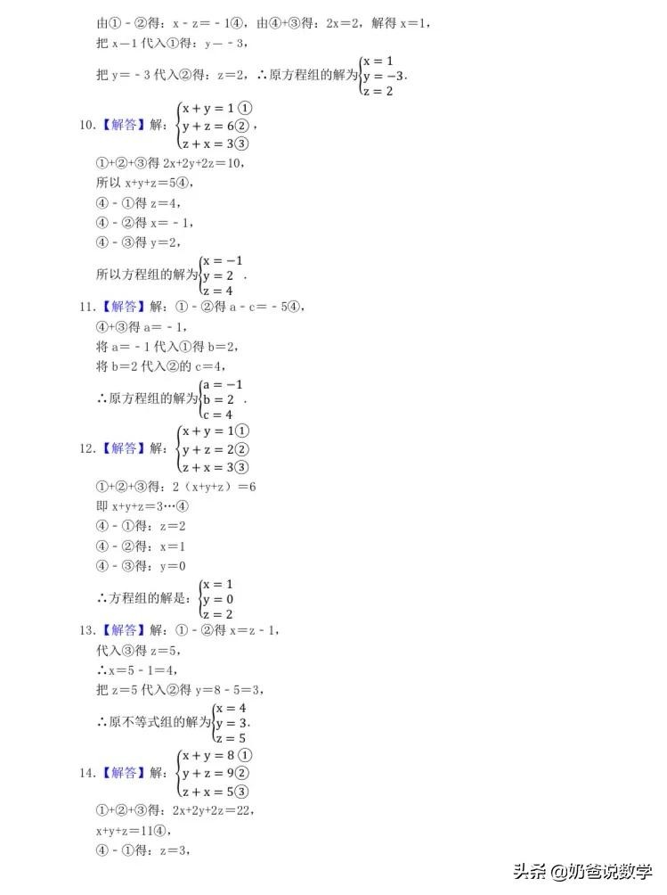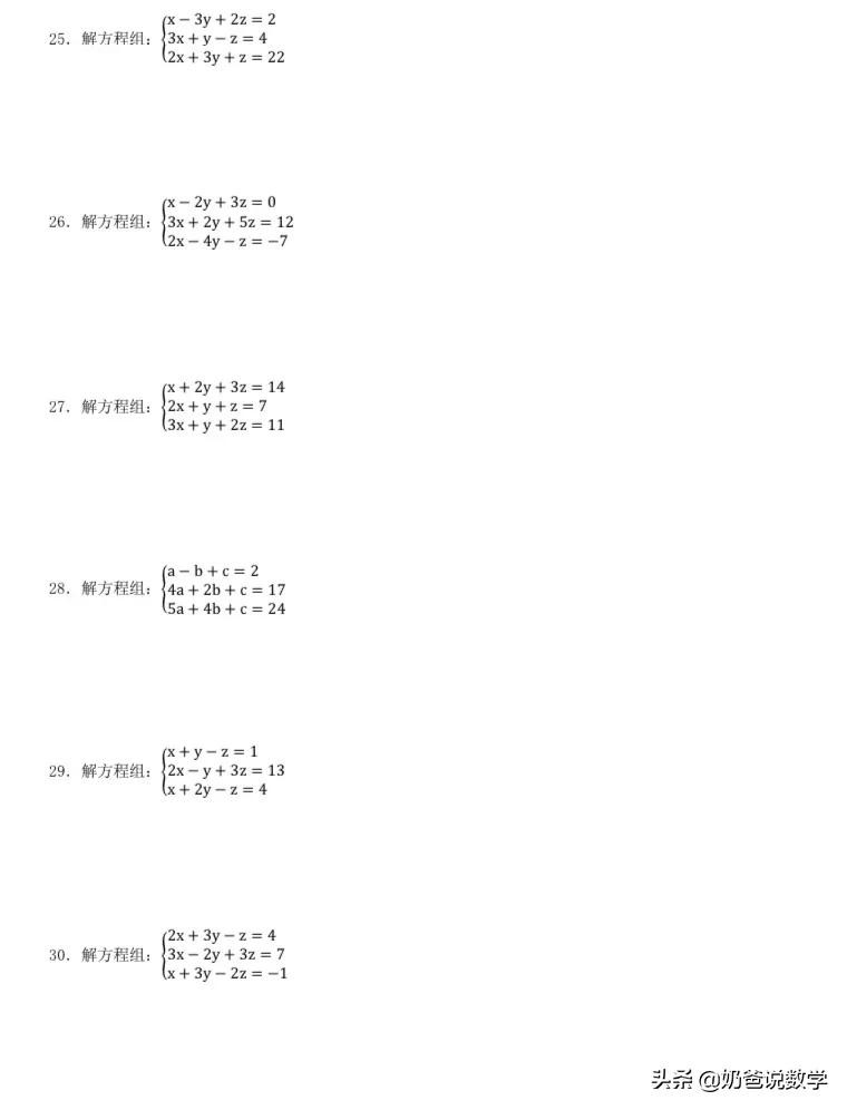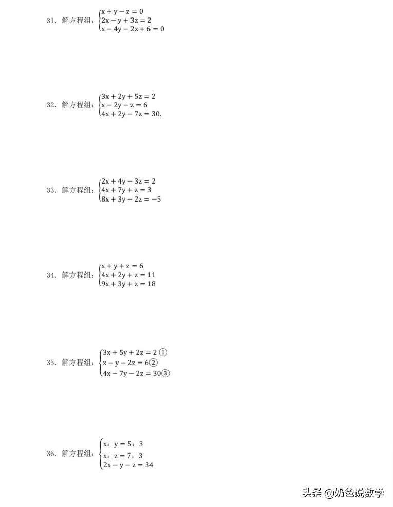 三元一次方程组计算50题,高清晰度可打印含答案
