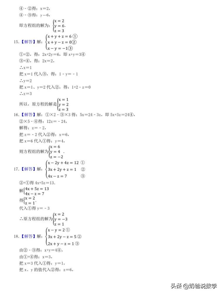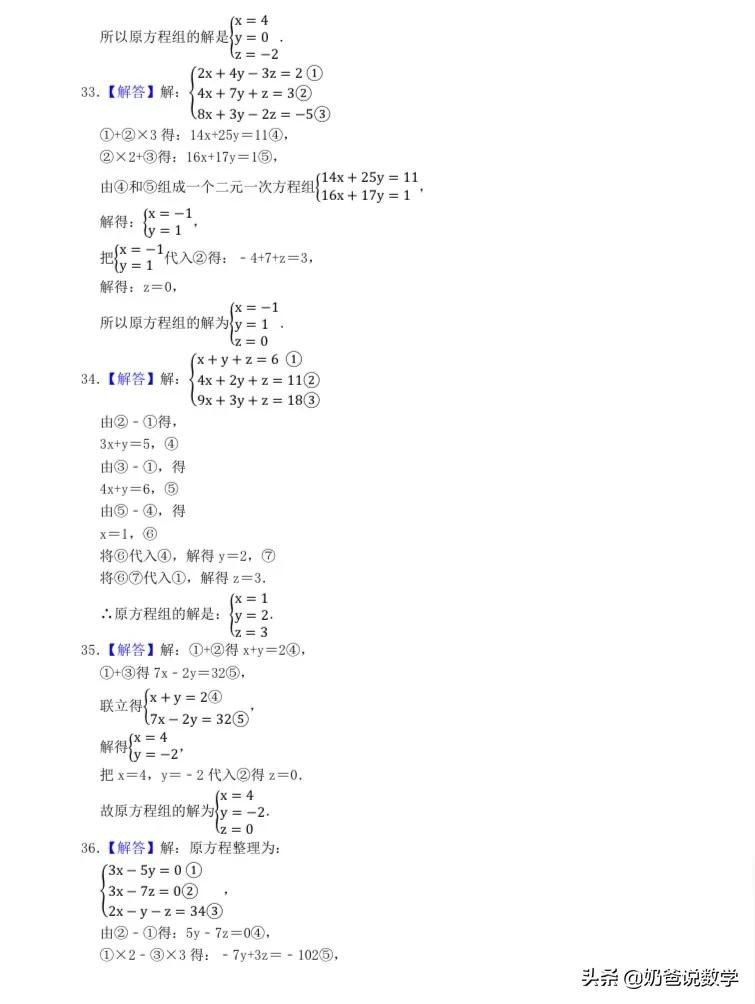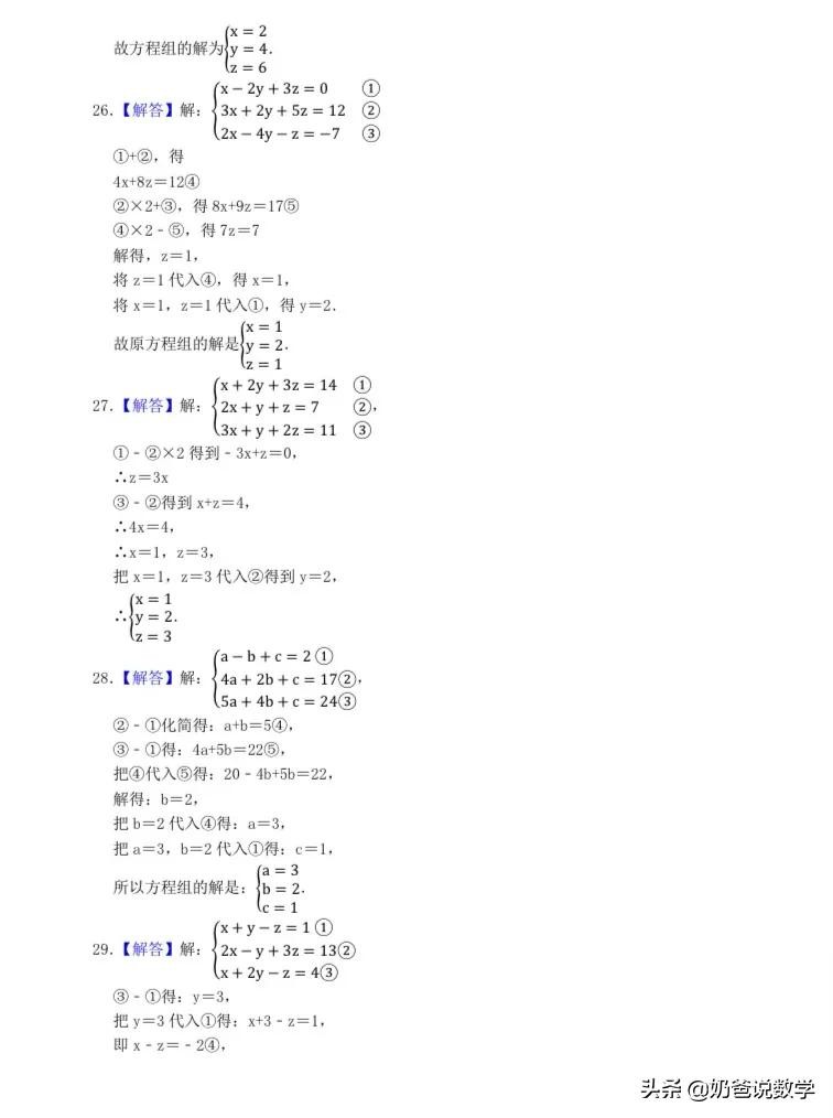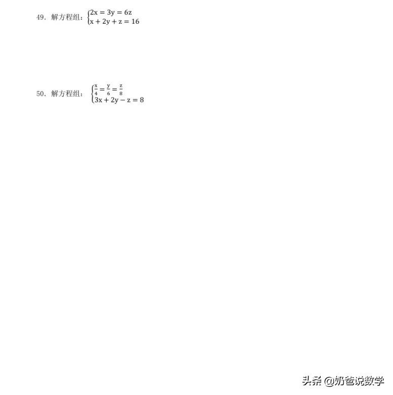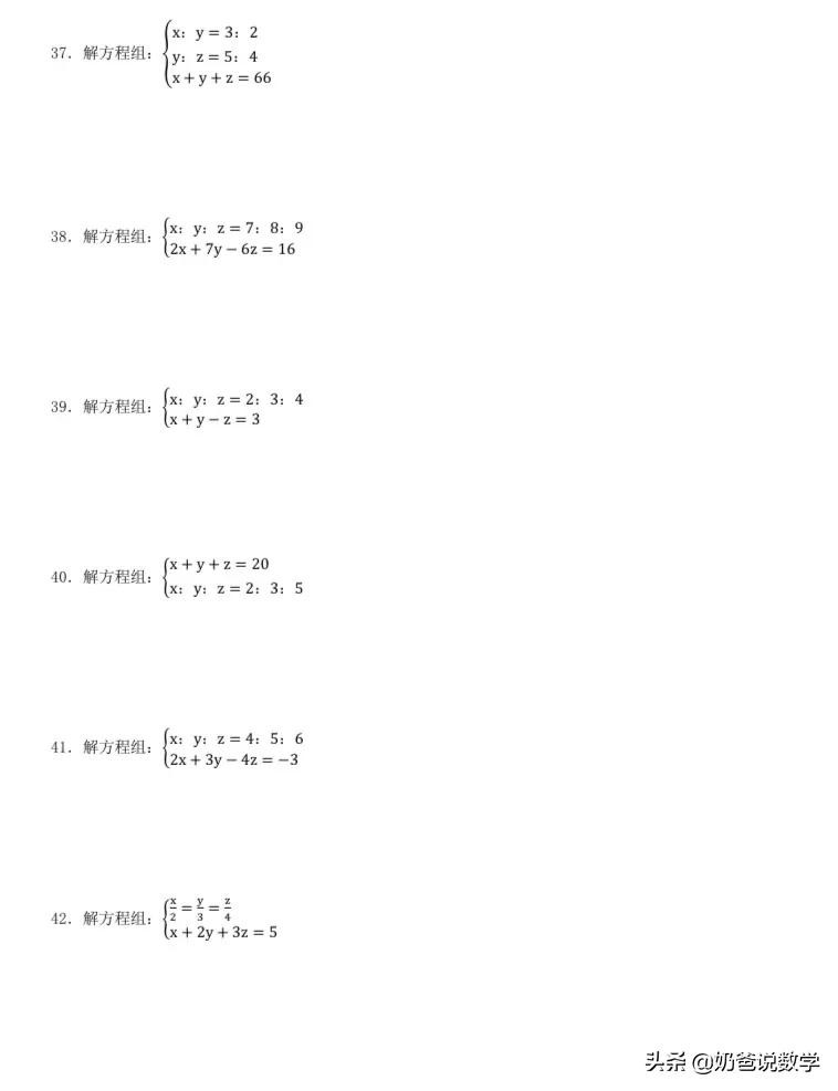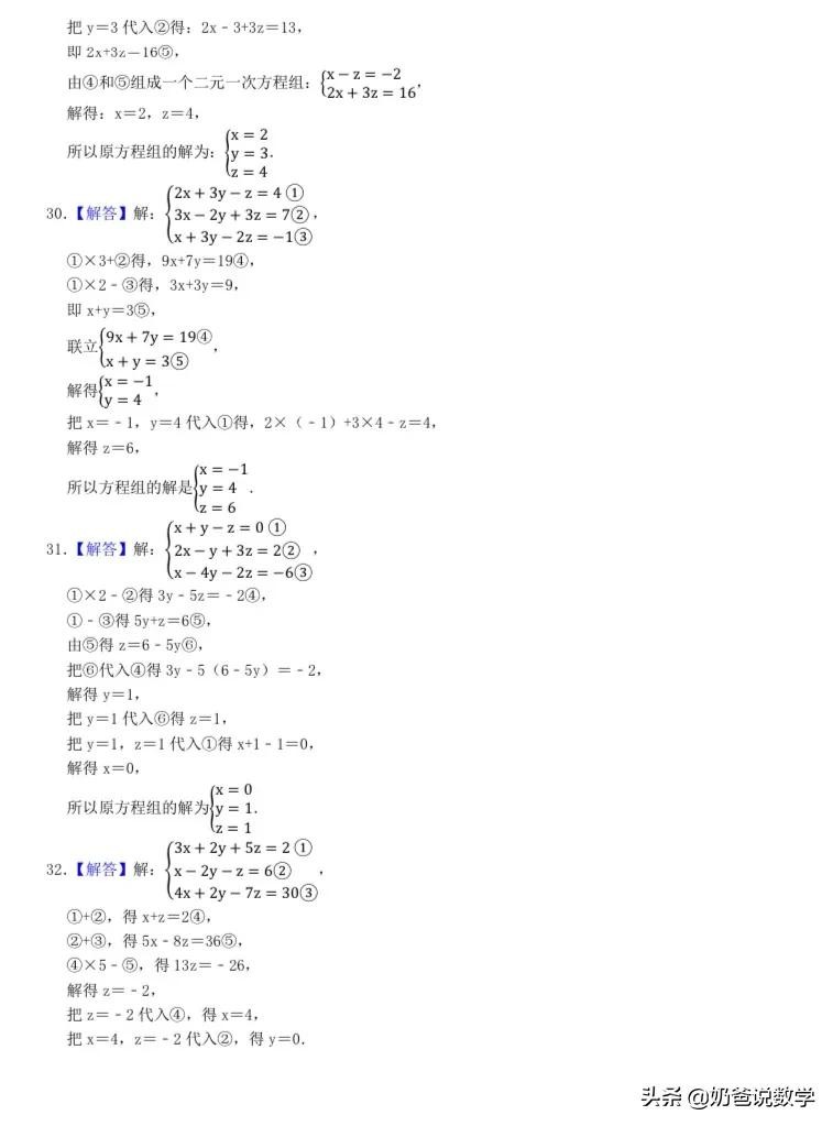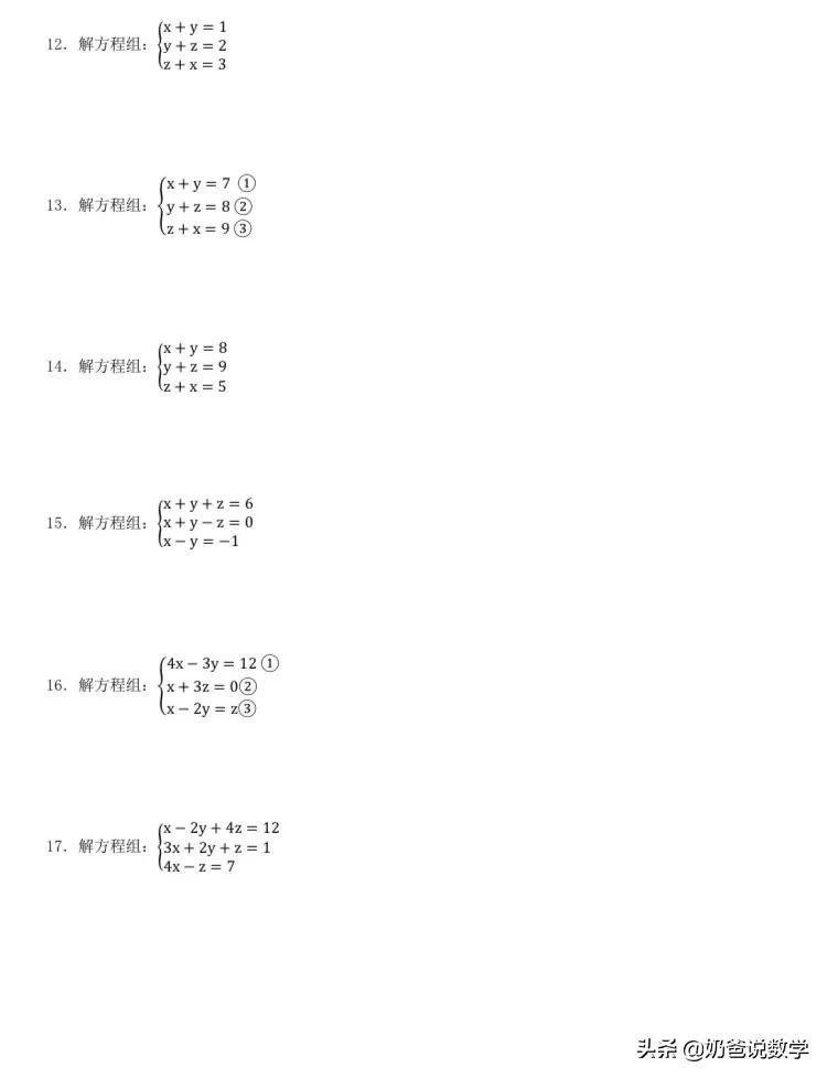 三元一次方程组计算50题,高清晰度可打印含答案