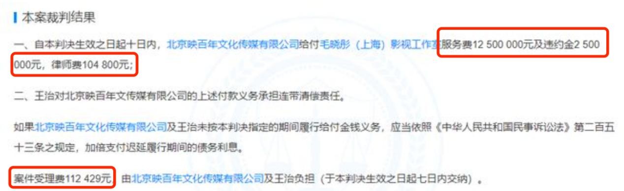 法院在12日公开了官司的判决书,法院判定该公司需要支付给毛晓彤1250万元的服务费加250万的违约金,同时需要承担10万多的律师费,以及案件受理费11万2千多元,共计1521万元左右。