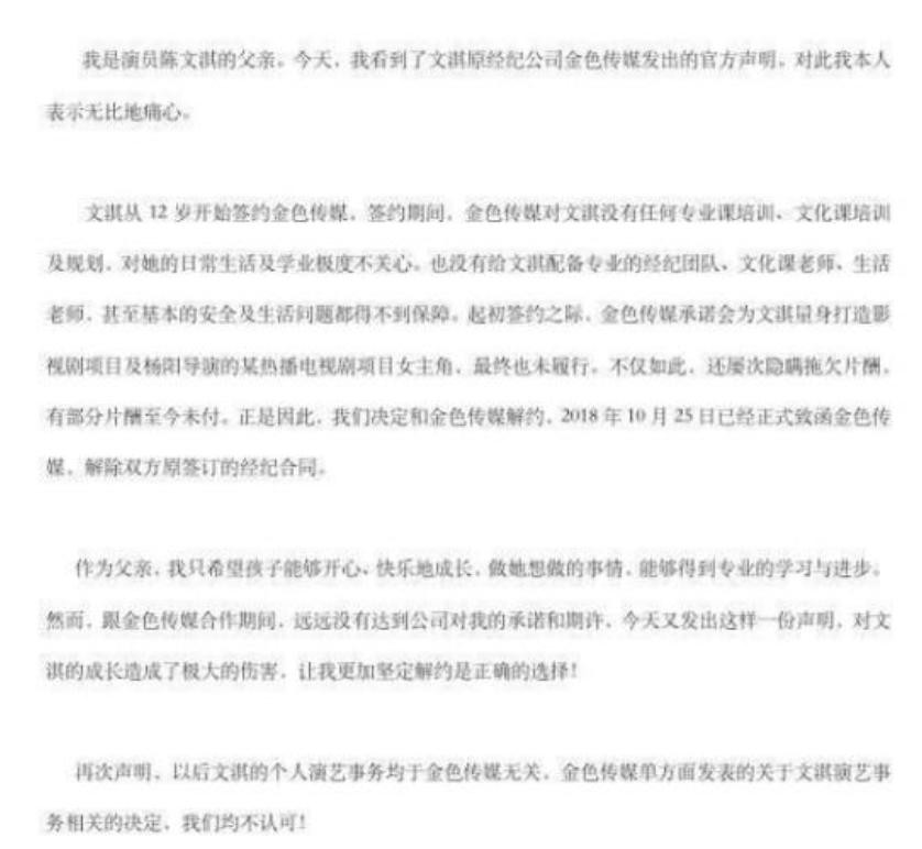 艺人片酬被拖欠在娱乐圈中并不罕见,童星出道的文淇就曾在2019年和自己的经纪公司打官司,文淇父亲表示对方存在严重违约行为,不仅拖欠片酬,对女儿也没有进行任何培训和教育,只好找律师解约,维护自己的正当权益。
