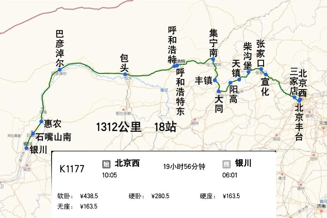 2024年12月9日起恢复开行北京西到银川K1177次列车,经京九铁路、丰沙铁路、京包铁路、包兰铁路运行,途径北京市、河北省、山西省、内蒙古自治区、宁夏自治区,1312公里,中途停靠16站,是北京到银川唯一一趟绿皮火车。
